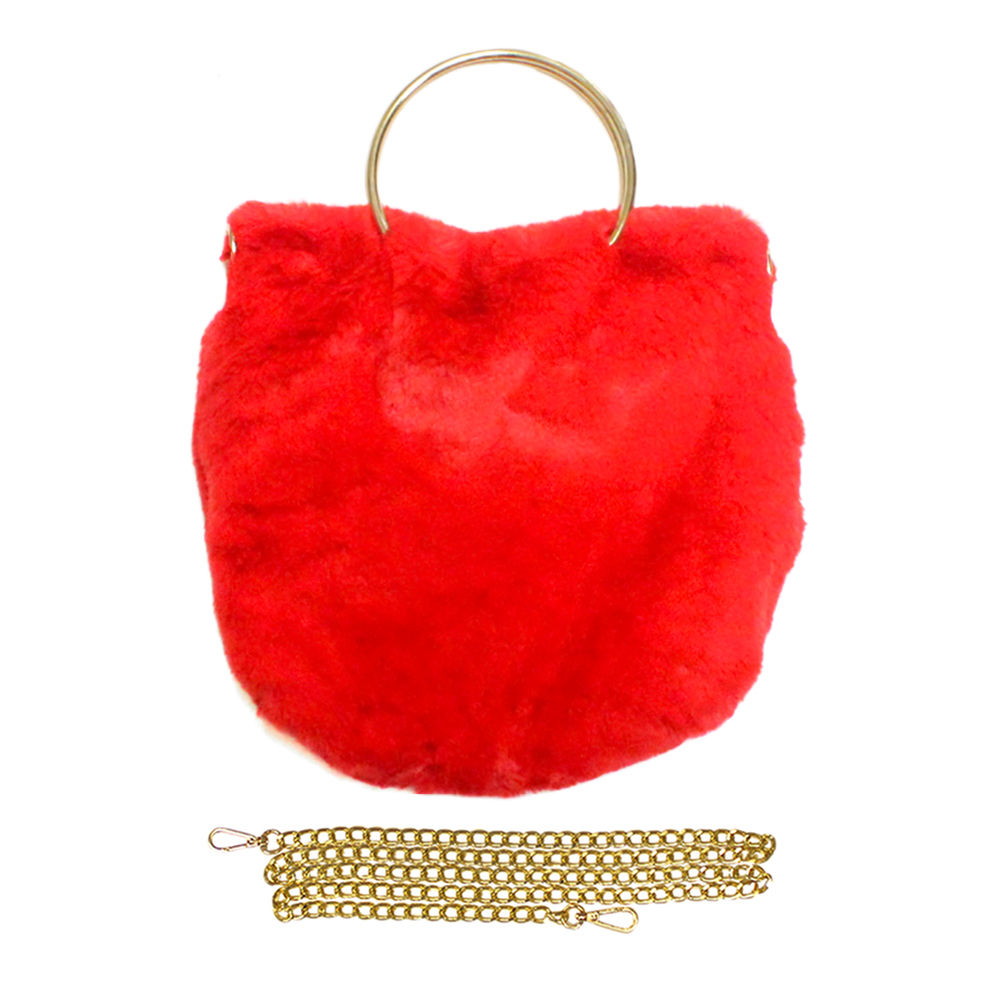 Details • Bag Size : 11.5" X 10.25" • Top Handle Size : 5" D • Strap Size : 24" L, Detachable • Material : 100% Polyester • Two Inside Slip Pocket • Magnetic Closure • Elevate your evening look with this faux fur crossbody bag, designed with a luxurious soft texture and elegant gold chain strap. Its compact silhouette and modern sophistication make it a perfect accessory for both special occasions and stylish everyday outings.