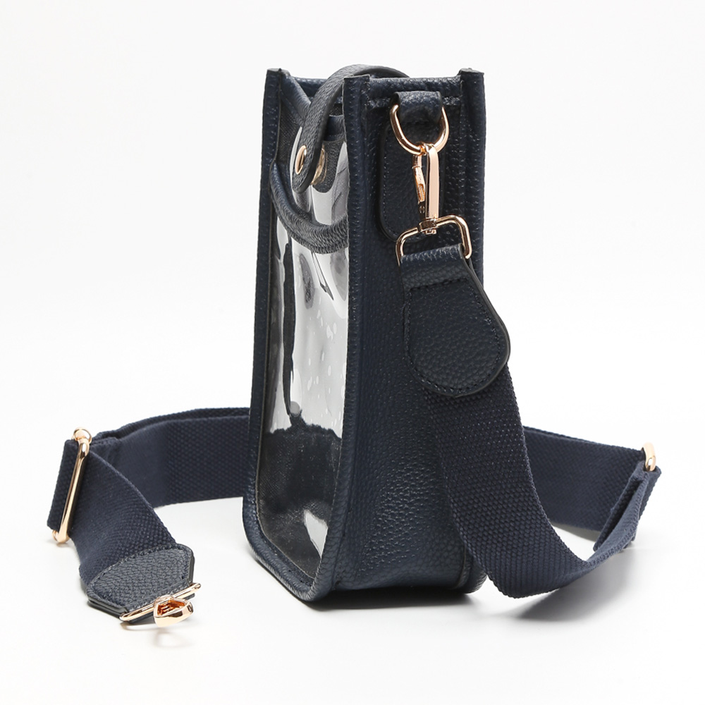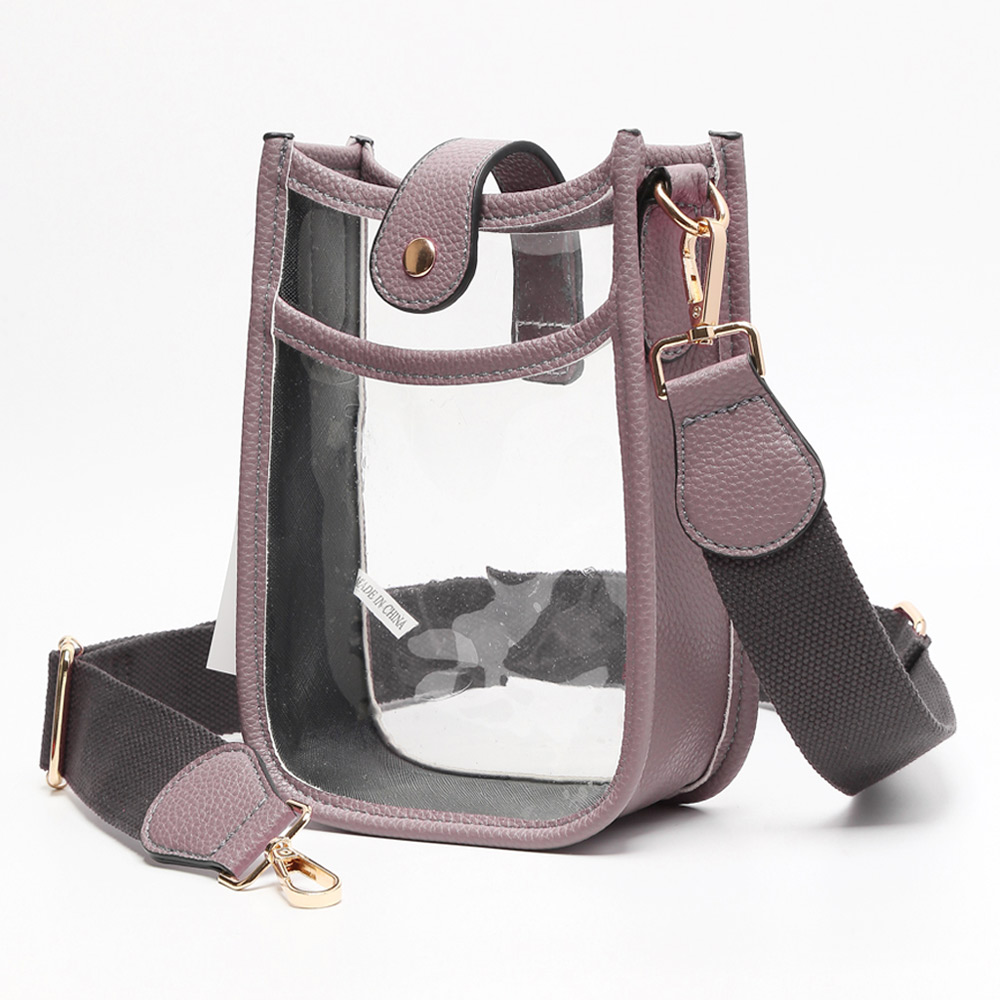 • Compact transparent crossbody bag with faux leather trim and adjustable wide strap. Stadium-approved design ideal for concerts, festivals, and sporting events. Secure snap closure and stylish silhouette.