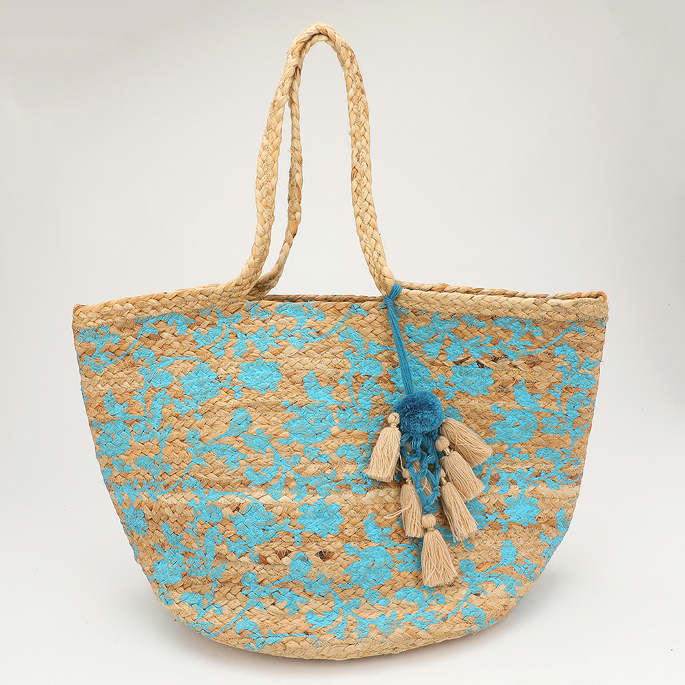 Details • Size : 20" X 11.75" X 9.5" • Strap Size : 9.15" L • Tassel Size : 12" L / Detachable • Make a stylish statement with this woven straw tote bag featuring vibrant blue floral embroidery and decorative tassels. Spacious and chic, it's the perfect carryall for beach days, markets, or weekend getaways. • Made In India