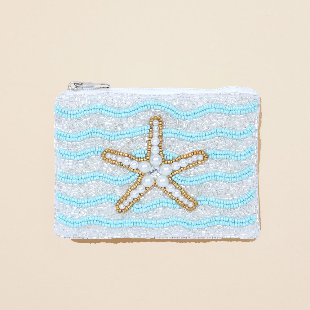 Details • Size : 5" X 3.75" (appx) • No Inside Pocket • Beads On Front Only • Bag Only (items are not included) • Zipper Closure • Embrace seaside charm with this intricately beaded coin pouch featuring a radiant starfish accent and wave-inspired detailing. Perfect for carrying small essentials, it adds a touch of coastal elegance to everyday outings and beach-ready looks with its eye-catching design. • Made In India