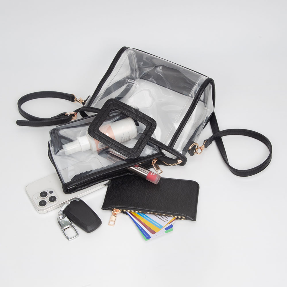 • Stylish clear 3-piece bag set featuring a structured top-handle tote, detachable crossbody insert and matching zip pouch. Ideal for stadium events and everyday organization, offering convenient storage, lightweight design and versatile carrying options for on-the-go use.