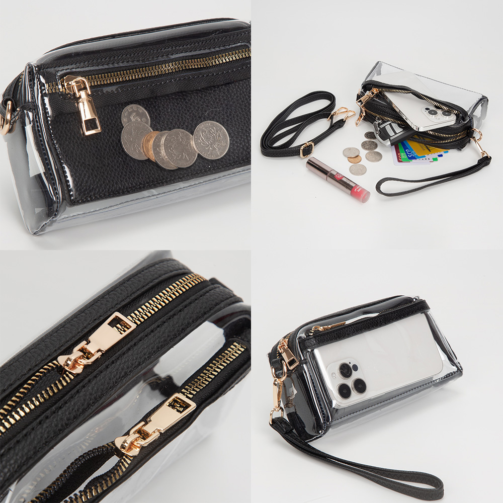 • Compact clear crossbody bag with dual zip compartments and an adjustable strap for convenient hands-free use. Perfect for stadiums, concerts, or travel, this transparent bag keeps essentials secure and visible while maintaining a stylish, practical design for everyday outings.