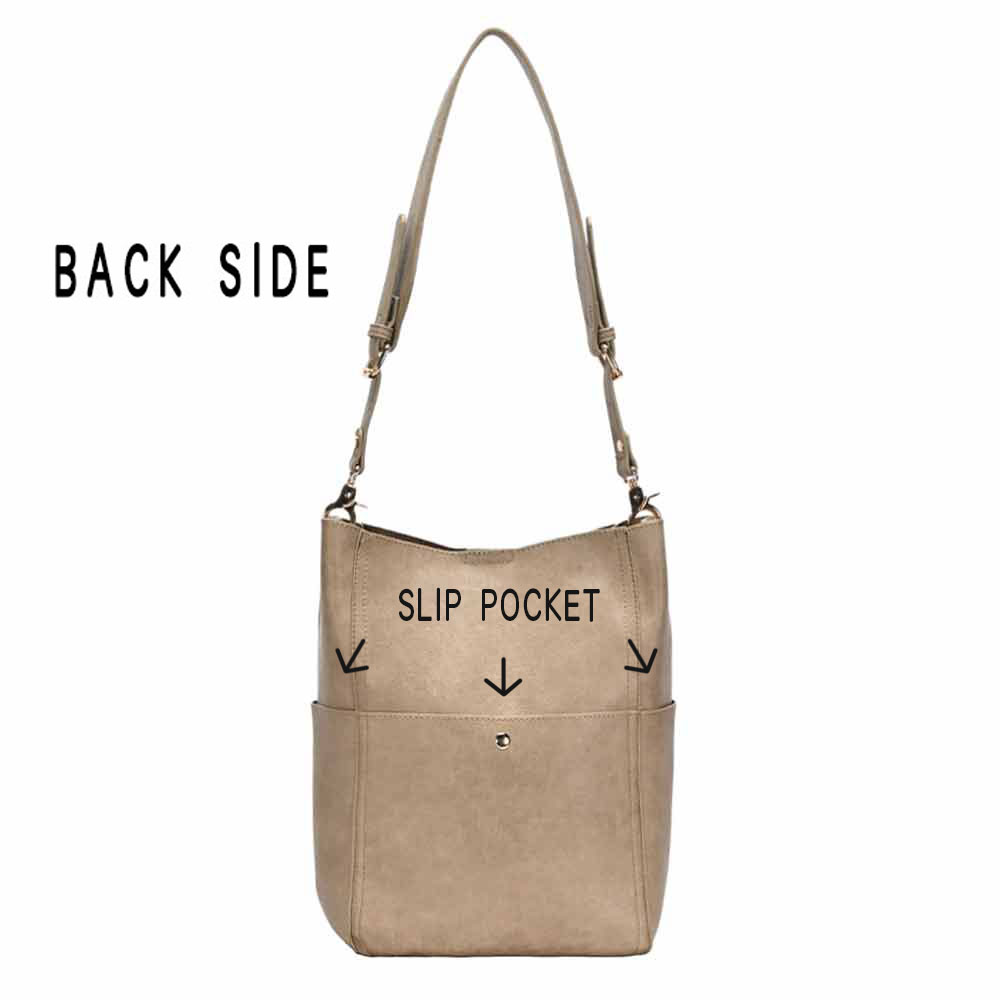 Details • Bag Size : 9" X 5" X 13" • Strap Size : Adjustable / Detachable • No Inside Any Pocket • Three Outside Slip Pockets • Magnetic Closure • Pouch Bag Size : 8.5" X 4" X 6" • One Inside Zipper Pocket • Two Inside Slip Pockets • Material : 100% PU (Shell), 100% Polyester (Lining) • Zipper Closure