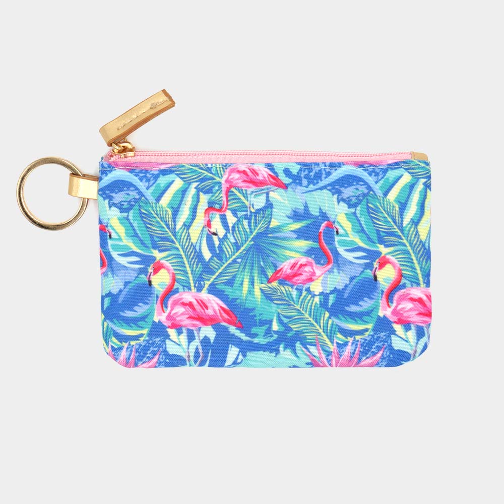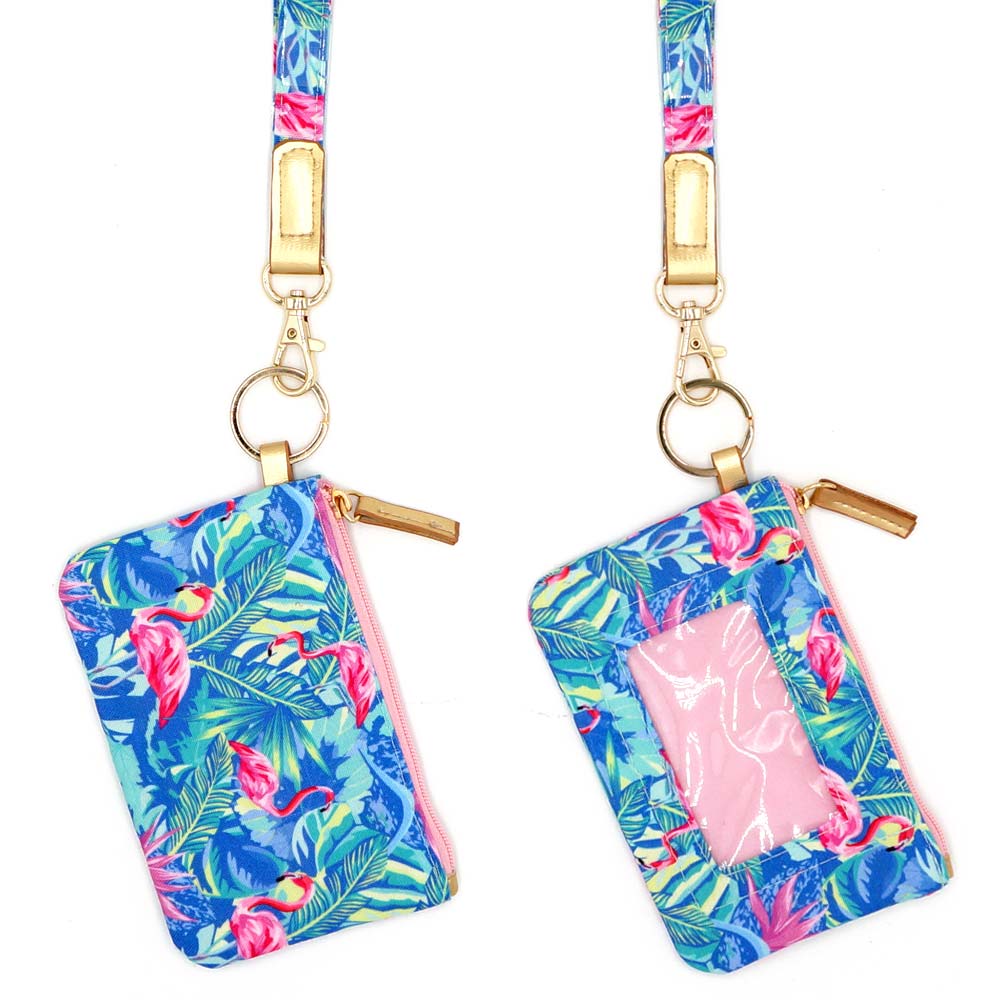 Flamingo Tropical Leaf Patterned ID Wallet Detachable Lanyard