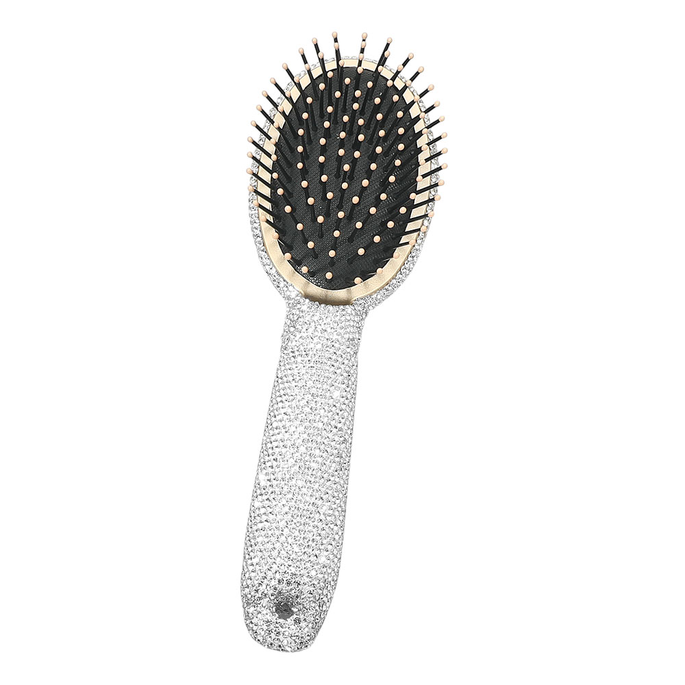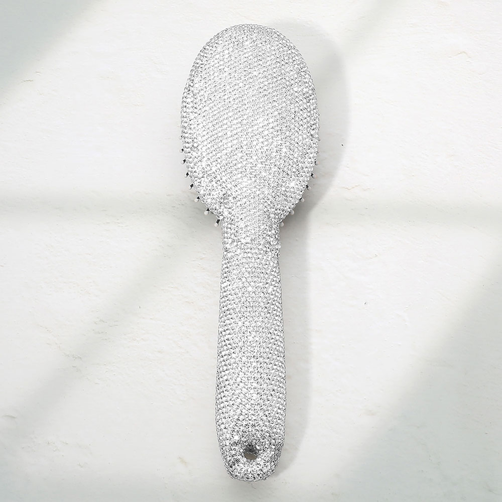 Details • Size : 3" X 9.5" • Statement hair brush designed with a crystal style handle and cushioned bristle base to help detangle and smooth hair with ease. Comfortable to hold and gentle on the scalp, this glam beauty essential is ideal for daily styling, gifting, or adding a polished touch to vanities and salon displays.