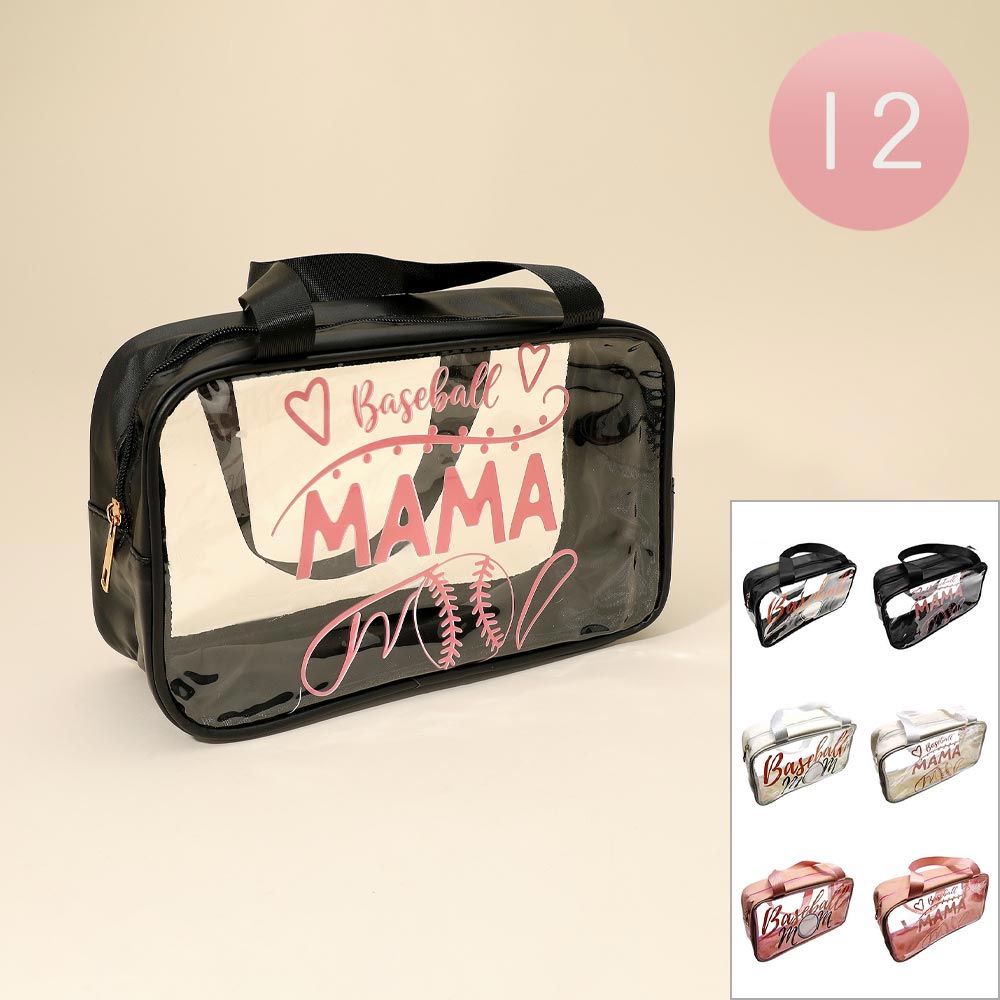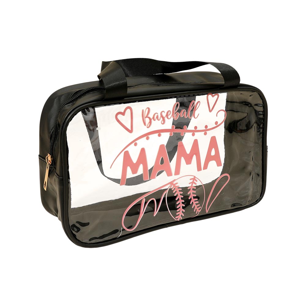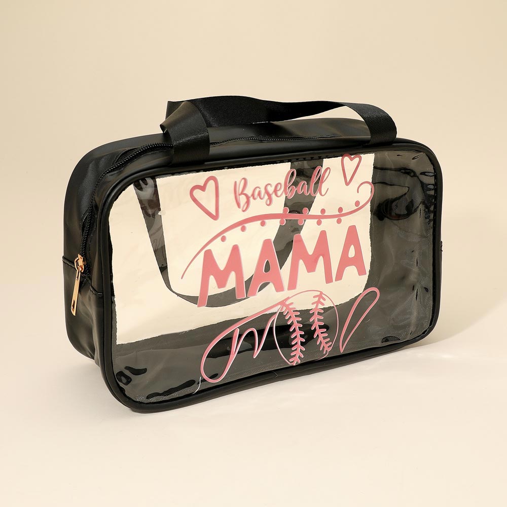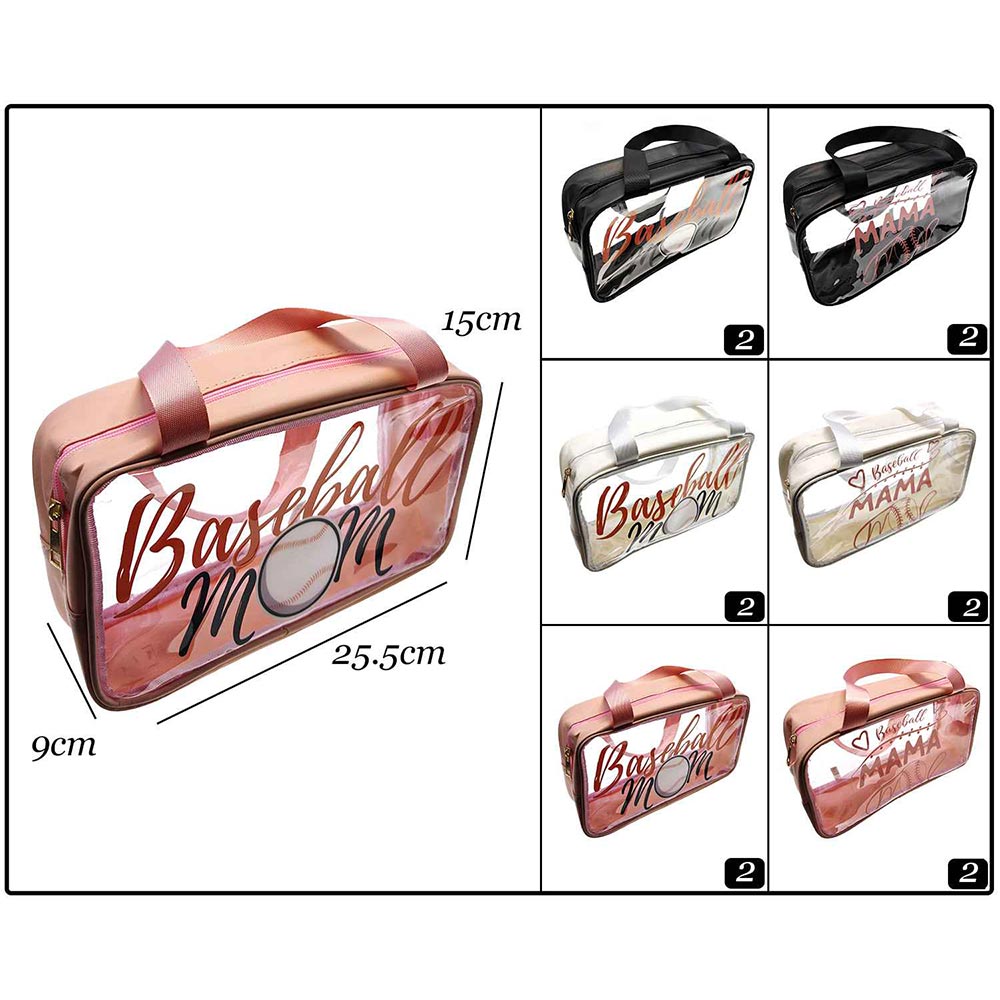 Details • Size : 10" X 6" X 3.5" • Top Handle Size : 5" L • Zipper Closure • A stylish clear organizer bag with “Baseball Mom” theme, designed for makeup, toiletries, and travel essentials. Features a roomy interior, easy-carry handles, and wipe-clean design, perfect for daily organization, trips, gym use, or thoughtful gifting.