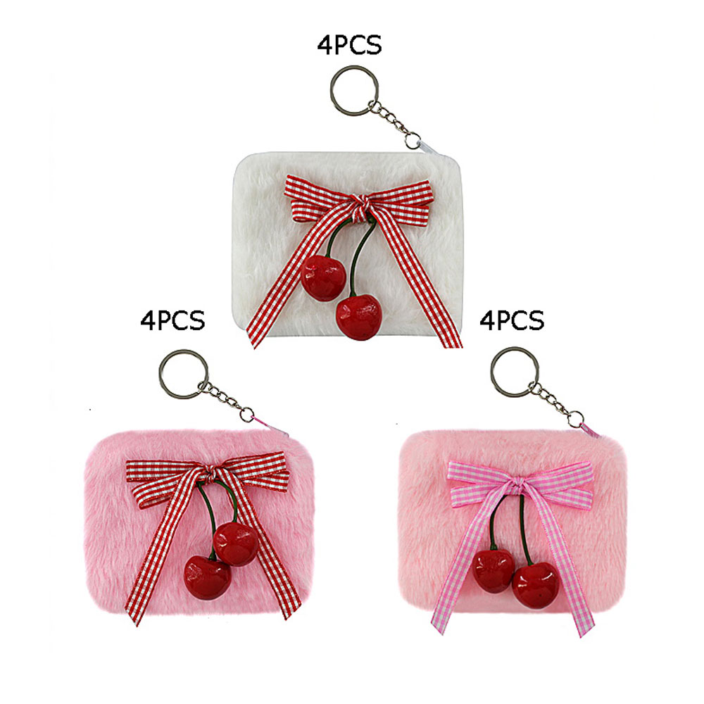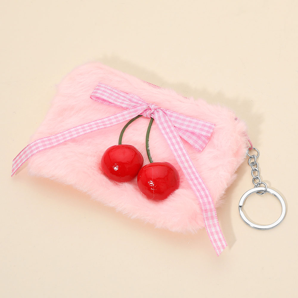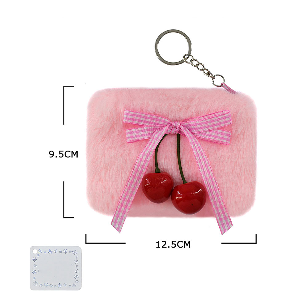 Details • Size : 5" X 3.4" • Zipper Closure • This fuzzy keychain pouch adds playful charm with a soft exterior and a cute cherry embellishment paired with a ribbon detail. Designed with a secure zipper and attached keyring, it’s perfect for carrying coins, earbuds, or small essentials while keeping them accessible on bags, keys, or backpacks.