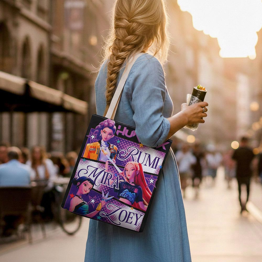 • Fan favorite character name graphic tote bag inspired by K-Pop Demon Hunters. Designed for pop culture lovers, this reusable tote is ideal for shopping, school, travel, or daily errands. A stylish carryall that combines function with bold character artwork and collectible appeal.