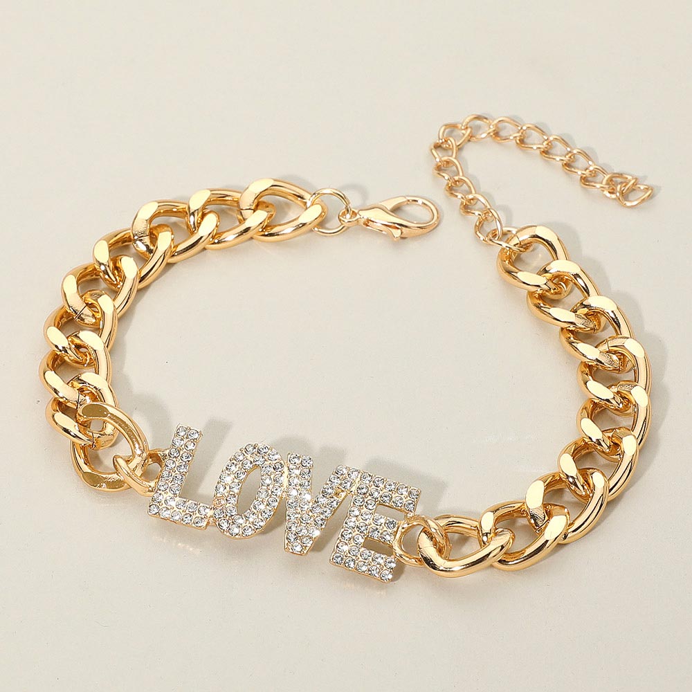 Details • Size : 0.6" H, 9.25" + 3" L • Lobster Clasp Closure • Express elegance and affection with this Love Letter Bracelet, featuring a chic chain design and shimmering crystal-studded “LOVE” charm. Perfect for adding a romantic touch to any outfit, this bracelet makes an ideal accessory for daily wear or as a heartfelt gift. • Lead and Nickel Compliant