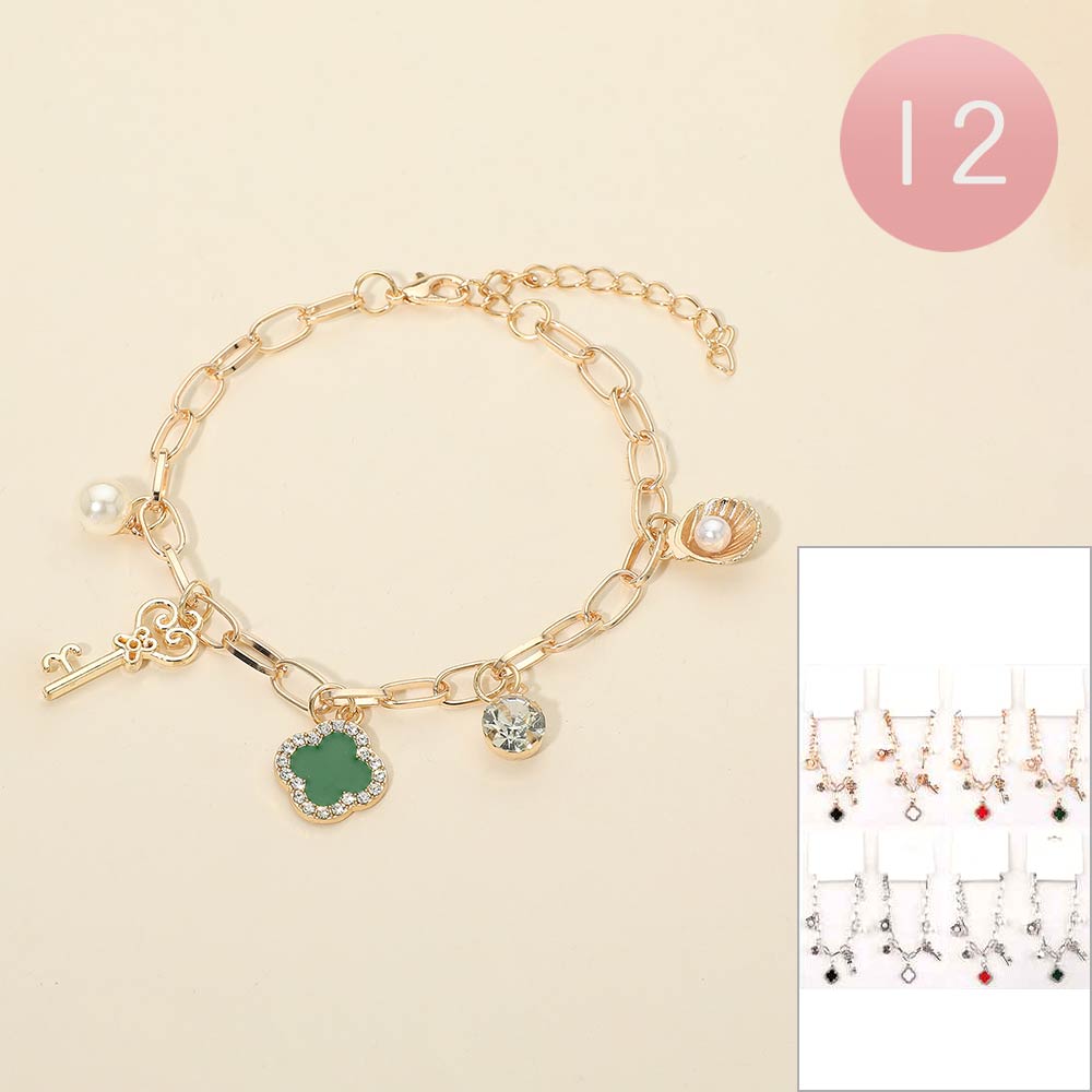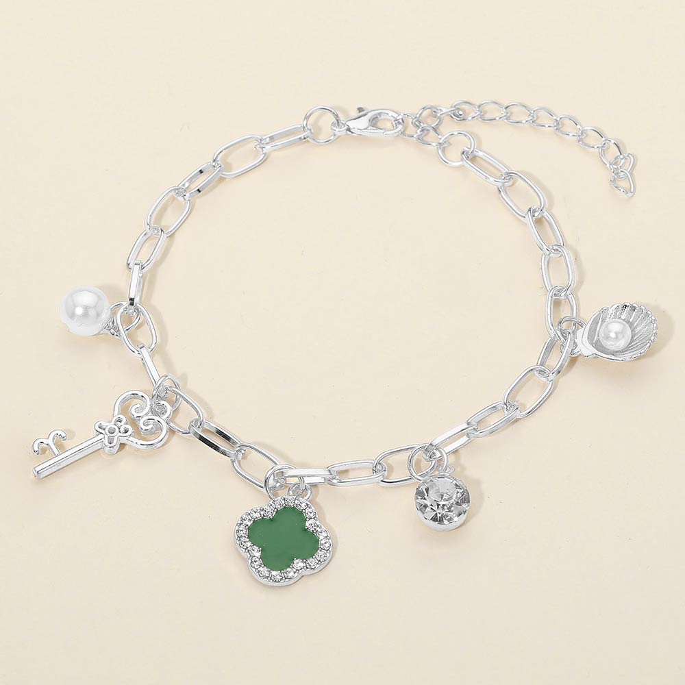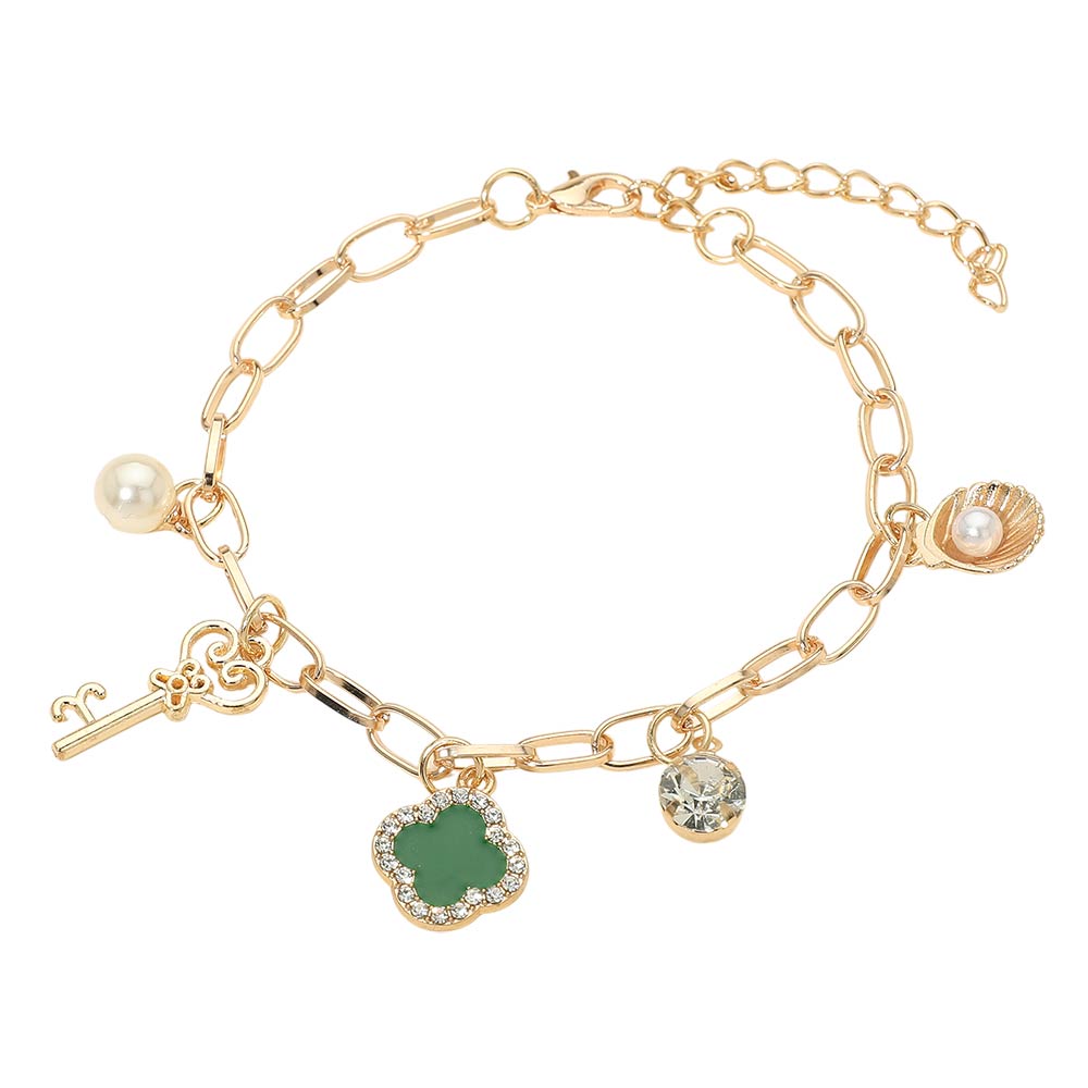 Details • Size : 0.2" H, 7.75" + 2" L • Charm Size : 0.8" L • Lobster Clasp Closure • This quatrefoil, pearl shell, key charm chain bracelet features a symbolic clover pendant, key accent, pearl-style detail, and crystal-inspired drop charms. Designed with a toggle closure and adjustable chain for easy wear, it’s a versatile accessory for everyday styling, giftable jewelry collections, and boutique selections focused on charm and meaning.