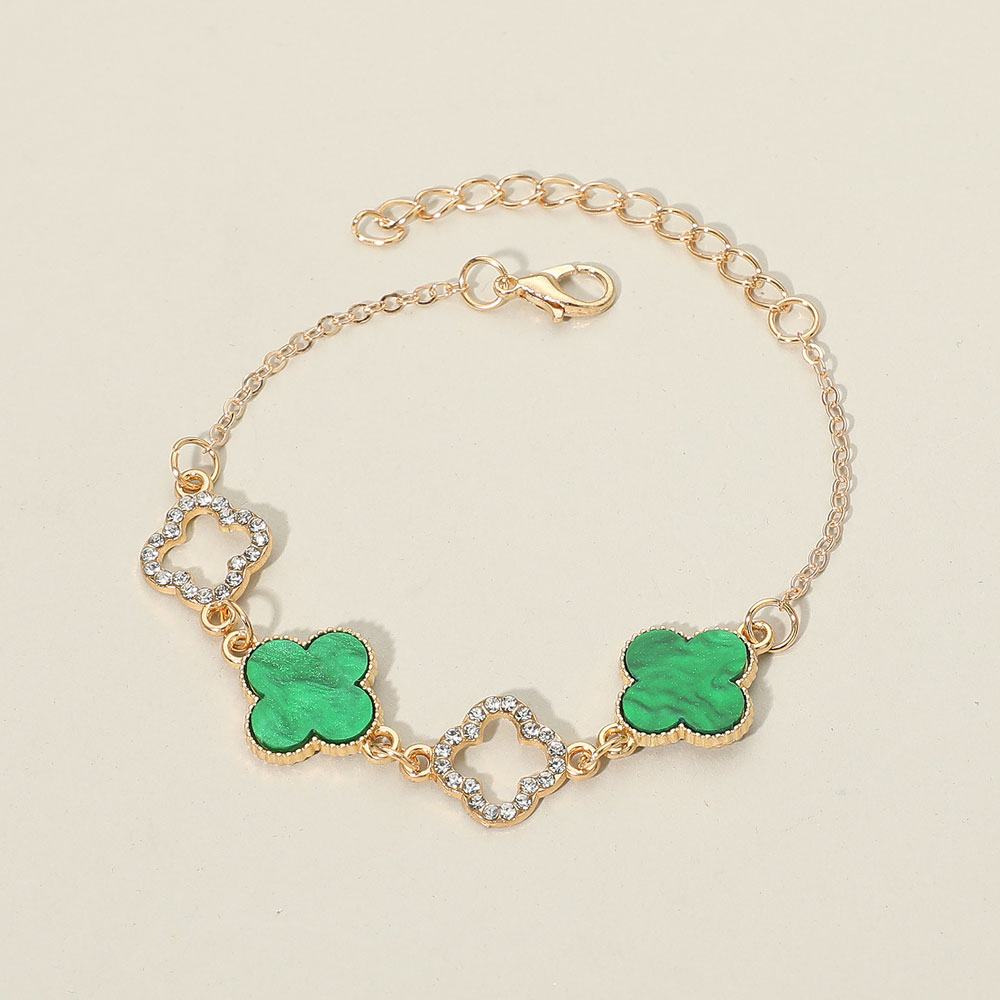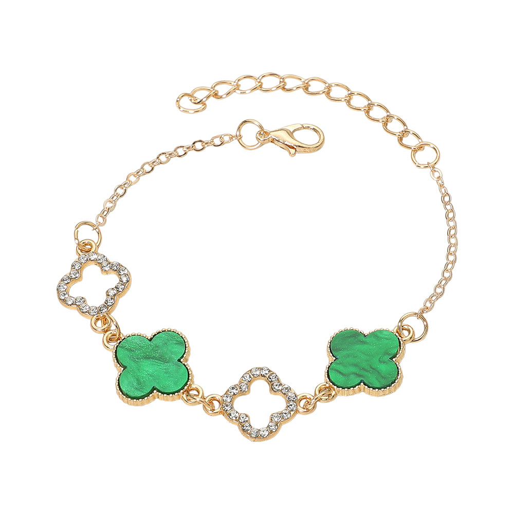 • This elegant bracelet features a series of quatrefoil-shaped links, alternating between enamel and crystal-studded designs for a refined, balanced look. The adjustable chain ensures a comfortable fit, making it a perfect accessory for adding subtle sparkle and charm to any outfit.