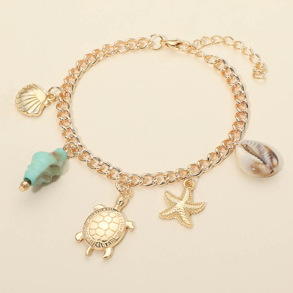 Details • Size : 0.2" H, 7.5" + 2.2" L • Charm Size : 1" L • Lobster Clasp Closure • This sea life charm chain bracelet features playful ocean-inspired charms including a turtle, starfish, shell accent, and natural-style bead detail. Designed with an adjustable chain for a flexible fit, it’s perfect for everyday styling, vacation-ready looks, and giftable charm jewelry collections for boutiques and seasonal assortments.