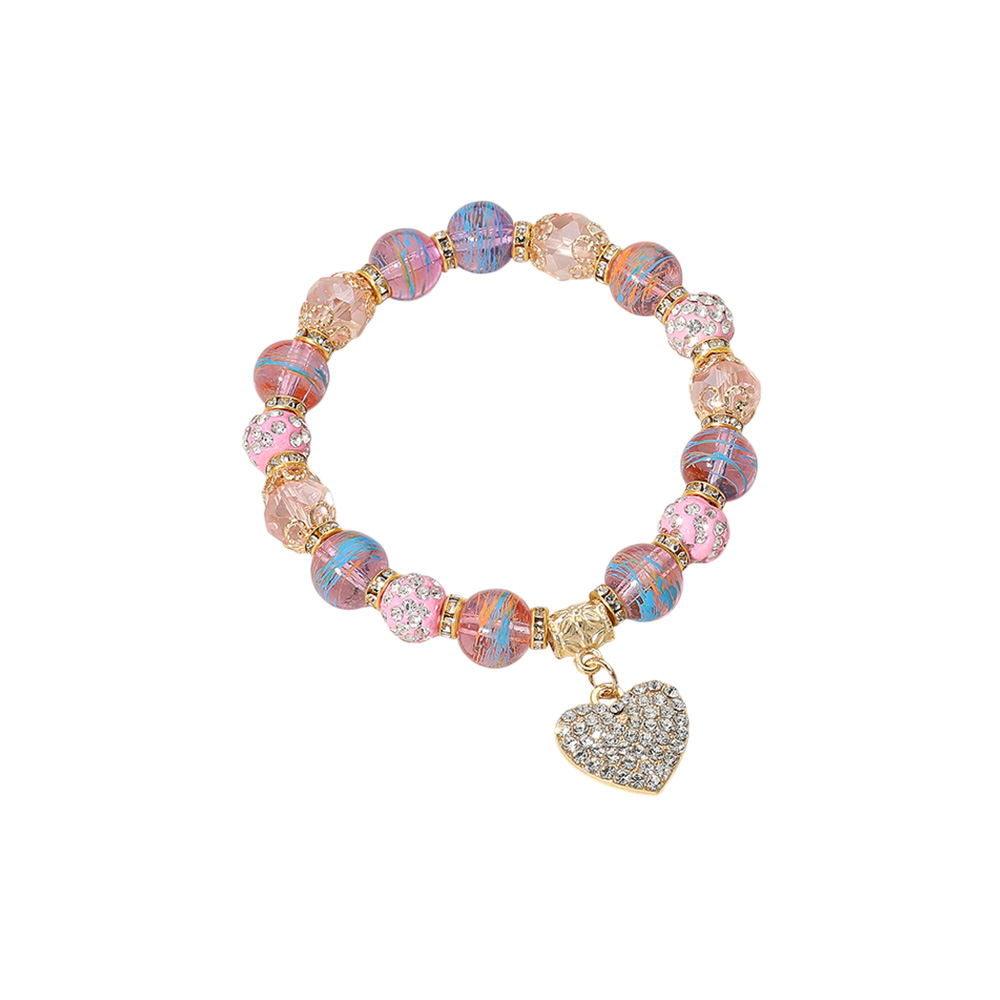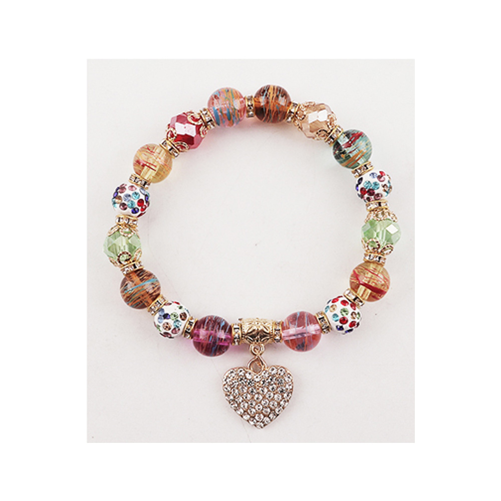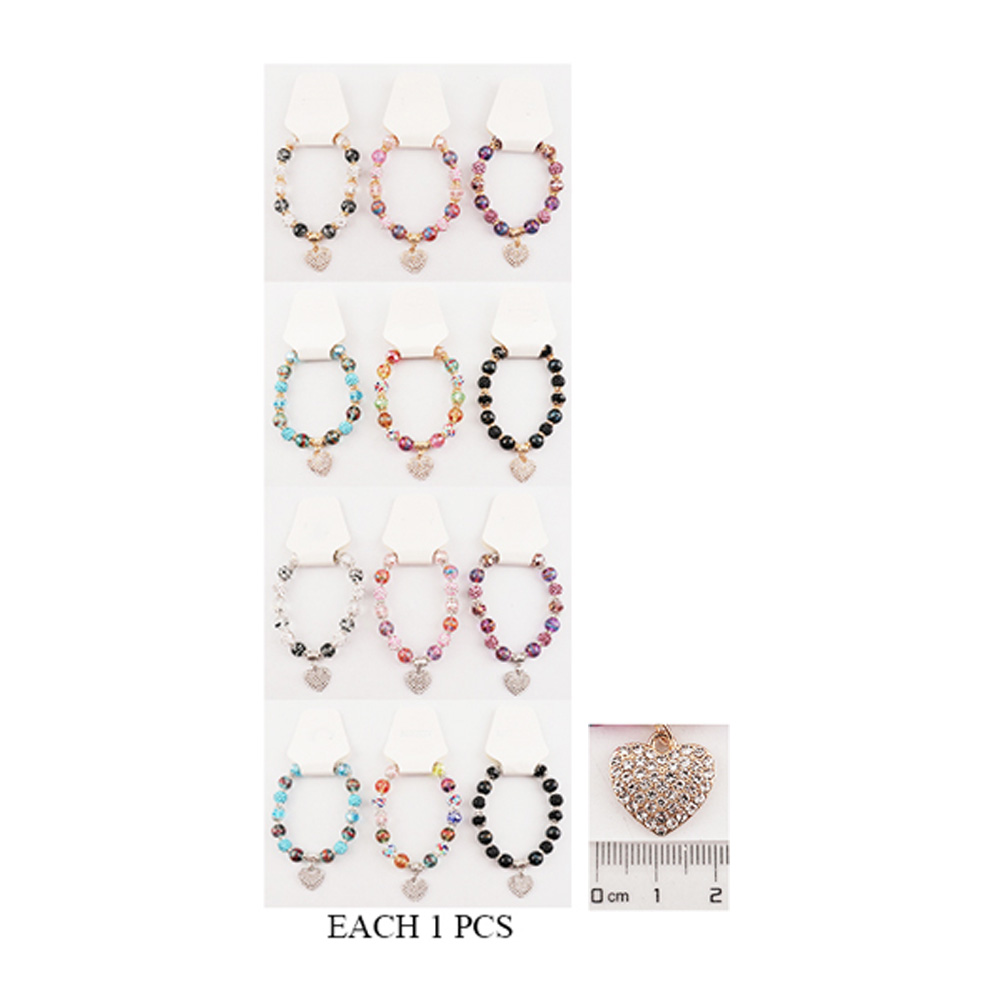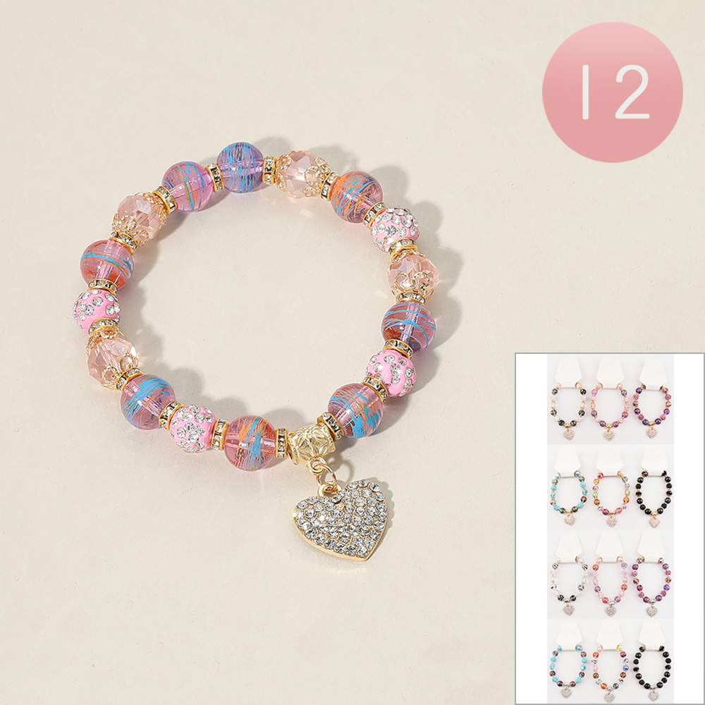 12PCS - Stone Paved Heart Charm Multi Beaded Stretch Bracelets