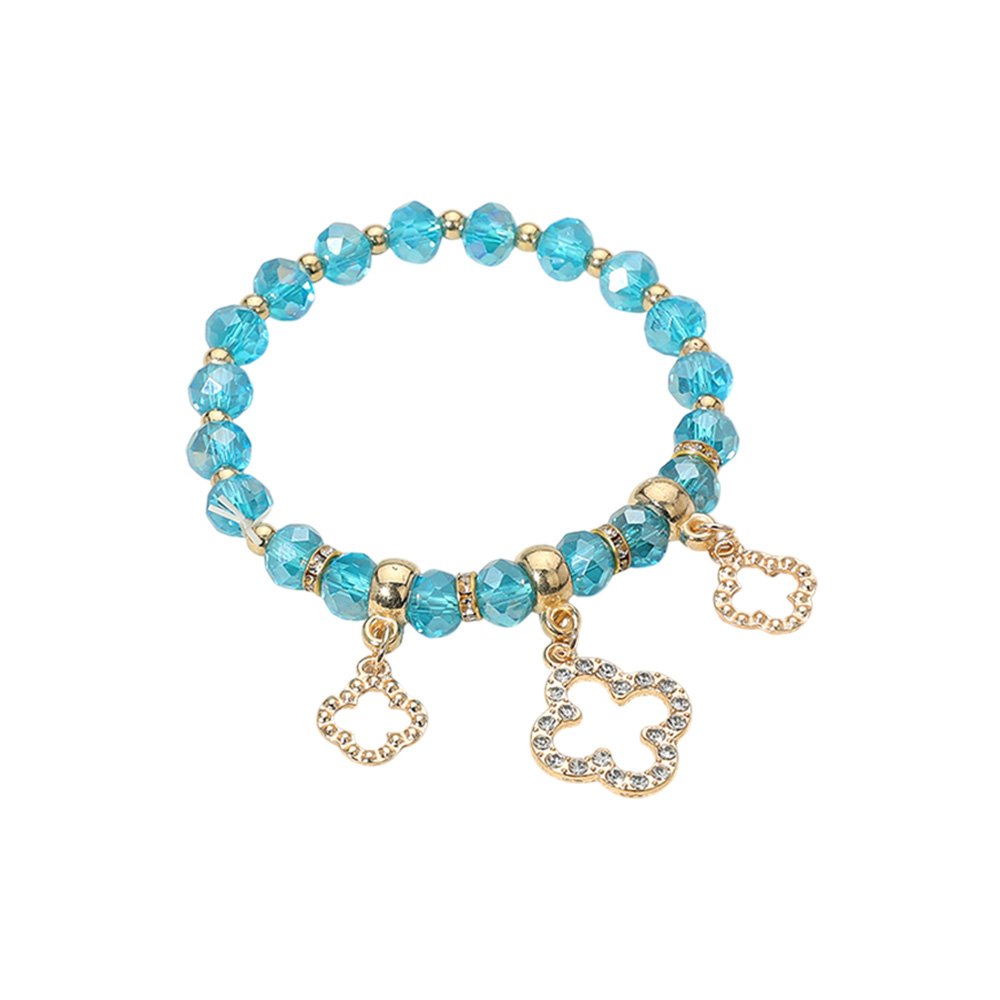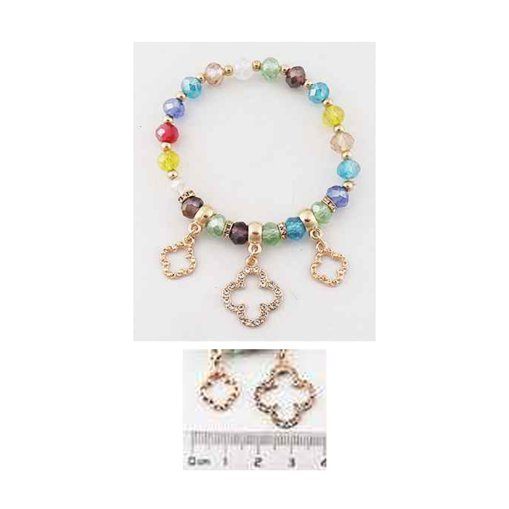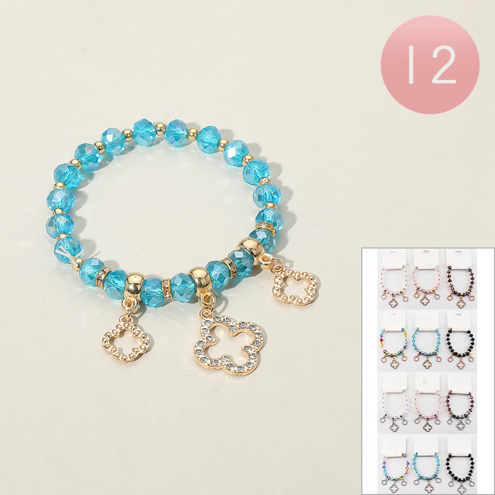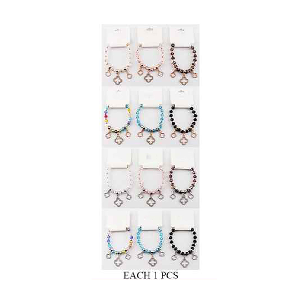 12PCS - Stone Paved Open Quatrefoil Charm Beaded Stretch Bracelets