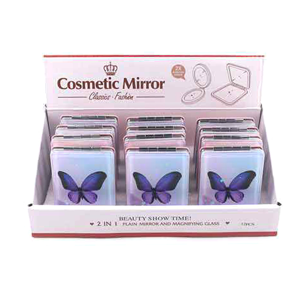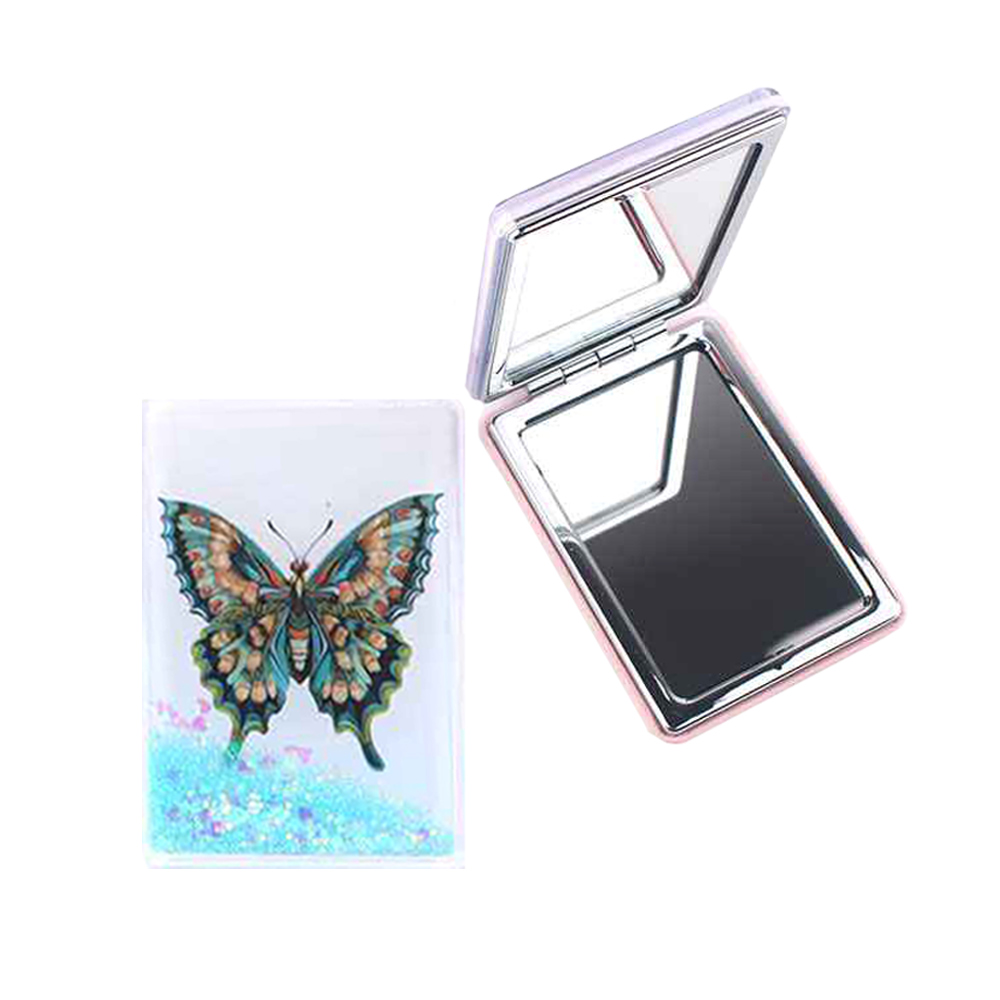 Details • Size : 2.4" X 3.3" • 2 In 1 - Plain Mirror And Magnifying Mirror • Charming butterfly compact mirror featuring a double-sided design in a slim, travel-friendly case. Glitter fluid adds a playful touch, while the clear artwork brings a stylish look. Ideal for touch-ups on the go and perfect as a small gift or everyday accessory.