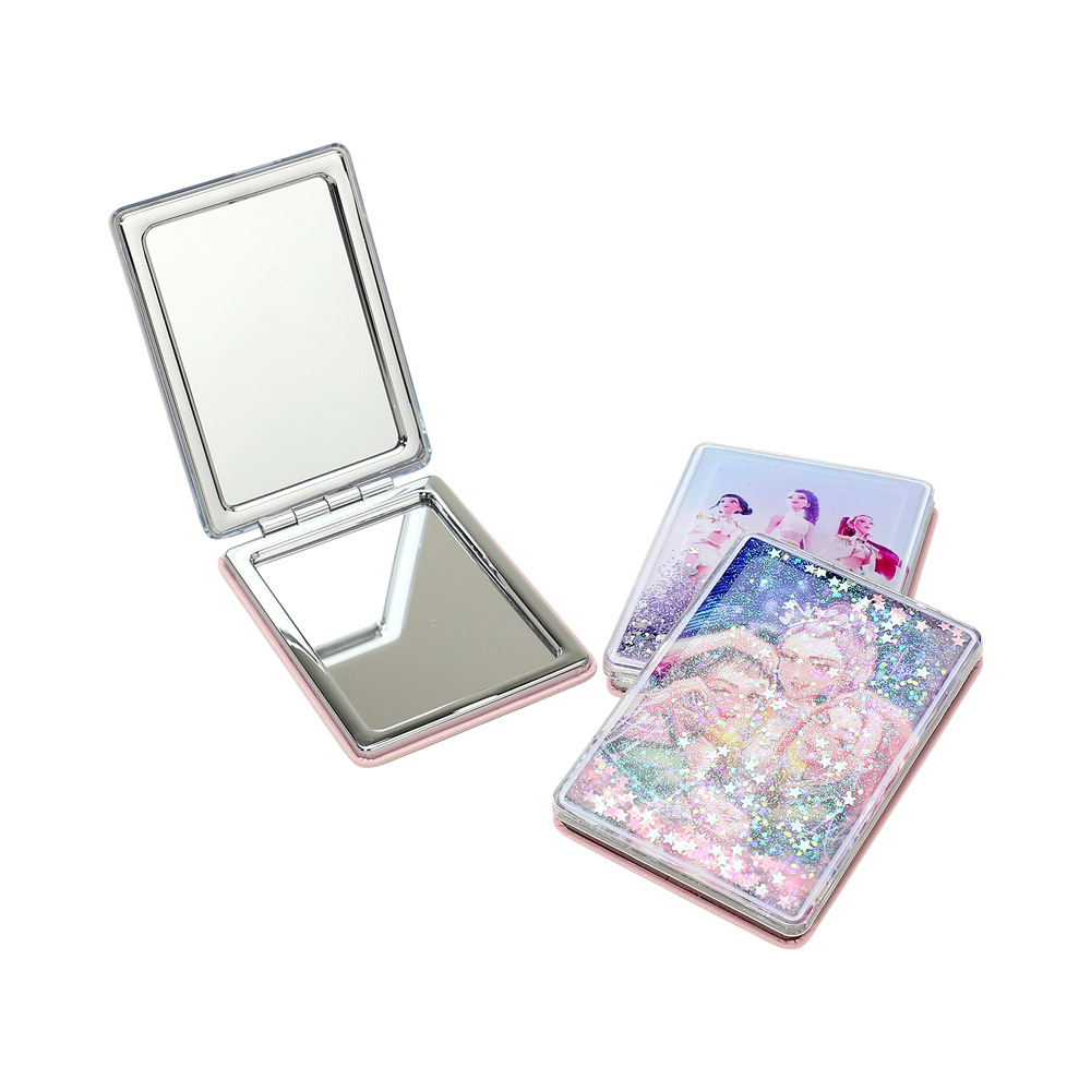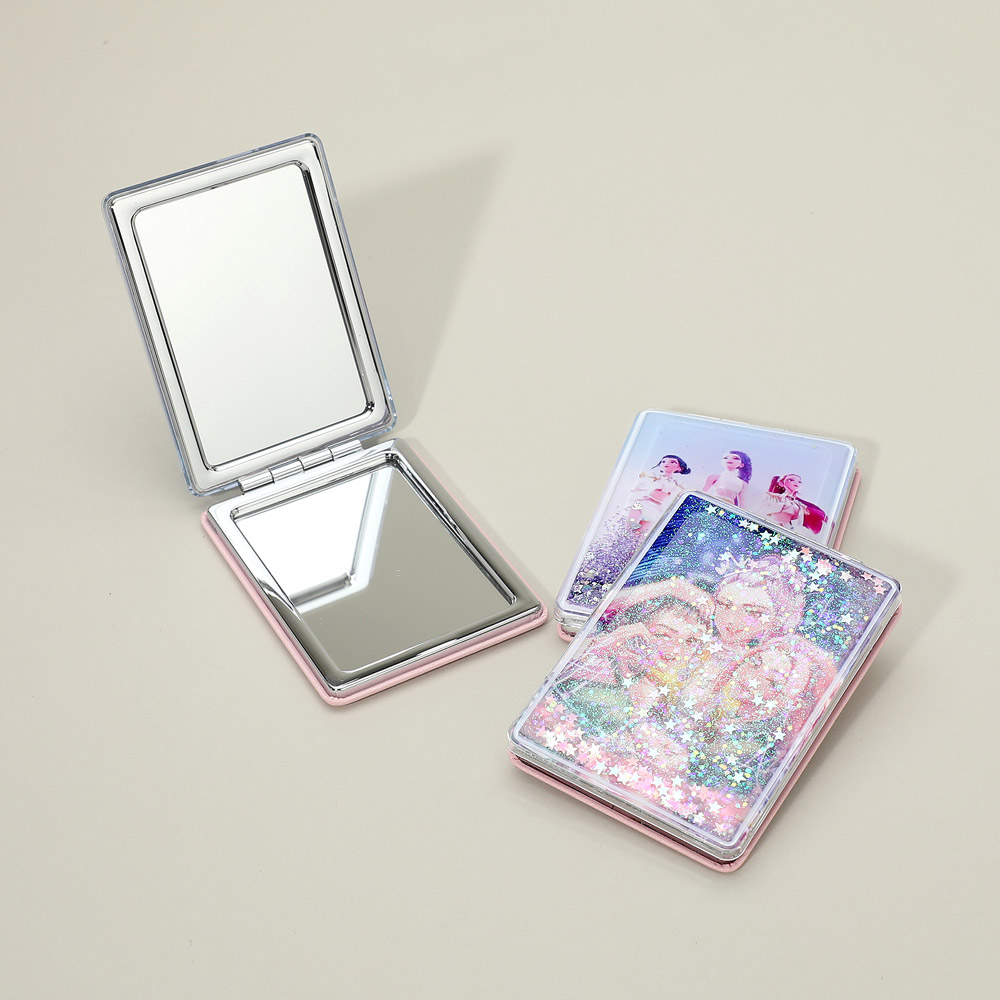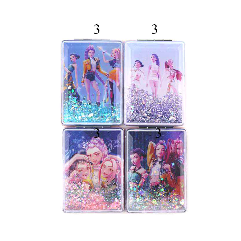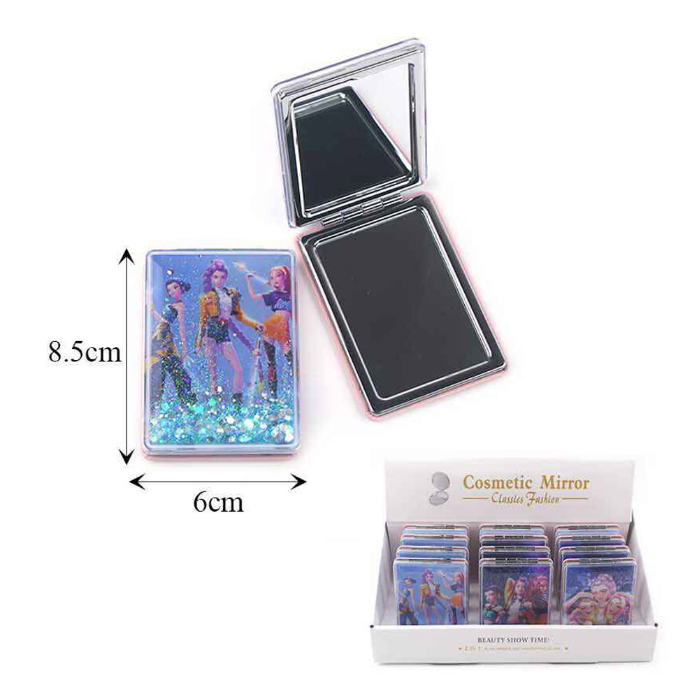 • Glitter kpop demon hunters HUNTRIX character compact pocket mirror featuring eye-catching illustrated designs and a folding double-mirror layout. Designed for quick touch-ups on the go, this portable accessory is ideal for gift shops, pop culture assortments, trend-driven displays, and impulse-buy collections seeking playful style and everyday practicality.