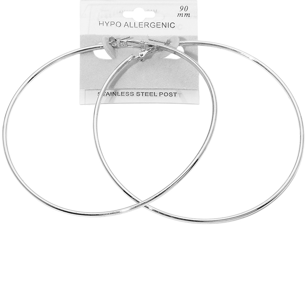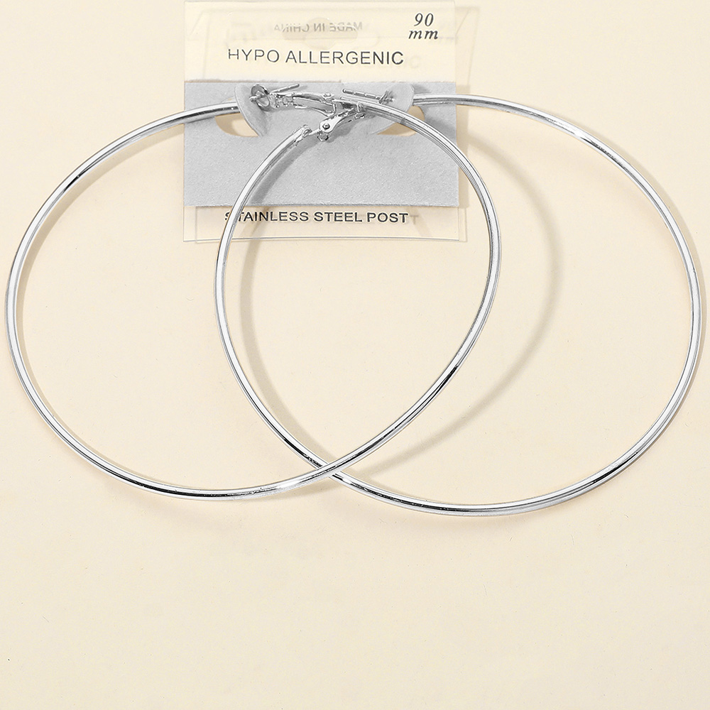 Details • Size : 3.7" X 3.7" • Omega Back • Stand out with these oversized 90mm hoop earrings featuring a sleek polished finish and hypoallergenic stainless steel posts. Lightweight and comfortable, they’re the perfect versatile accessory to enhance any outfit, from everyday wear to special occasions. • Hypoallergenic • Stainless Steel
