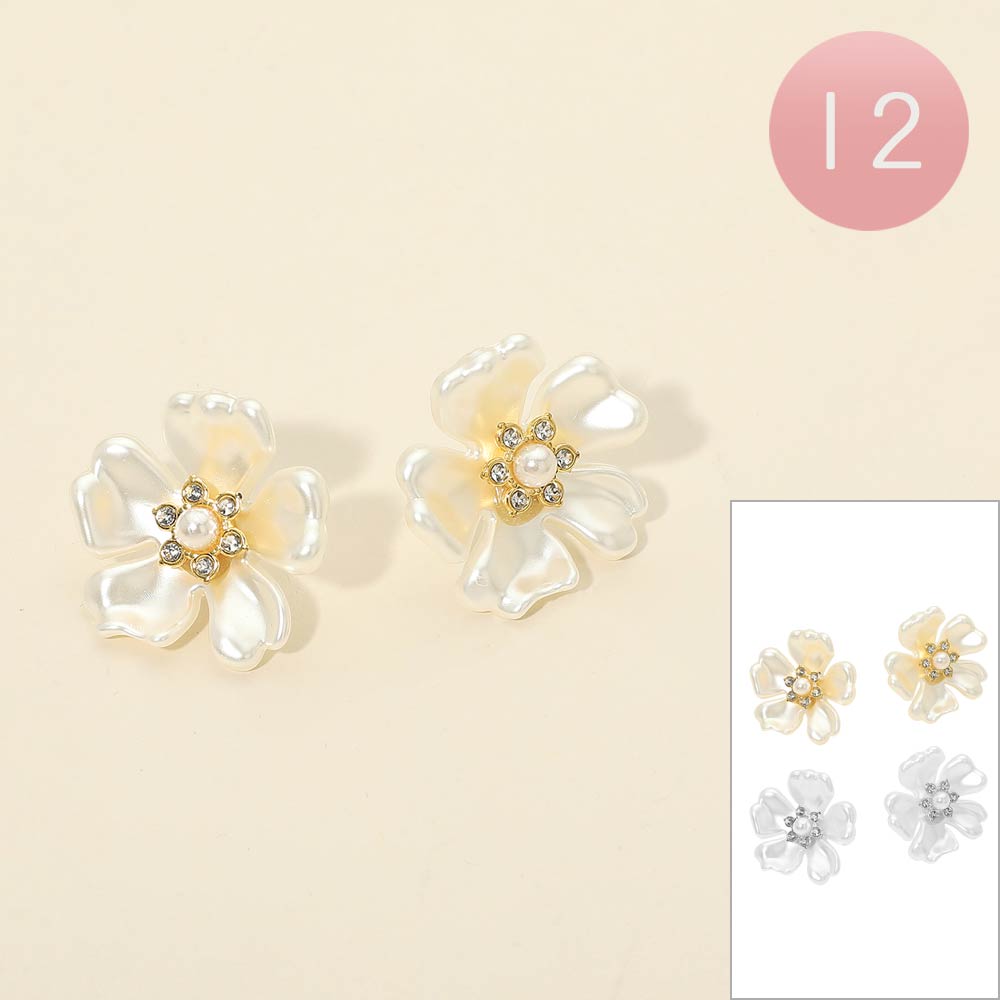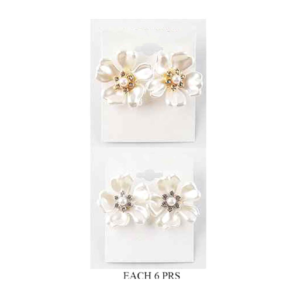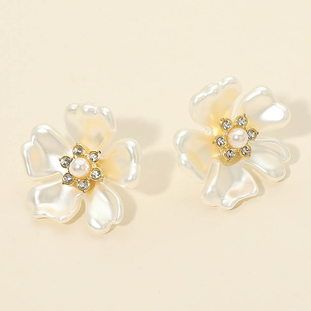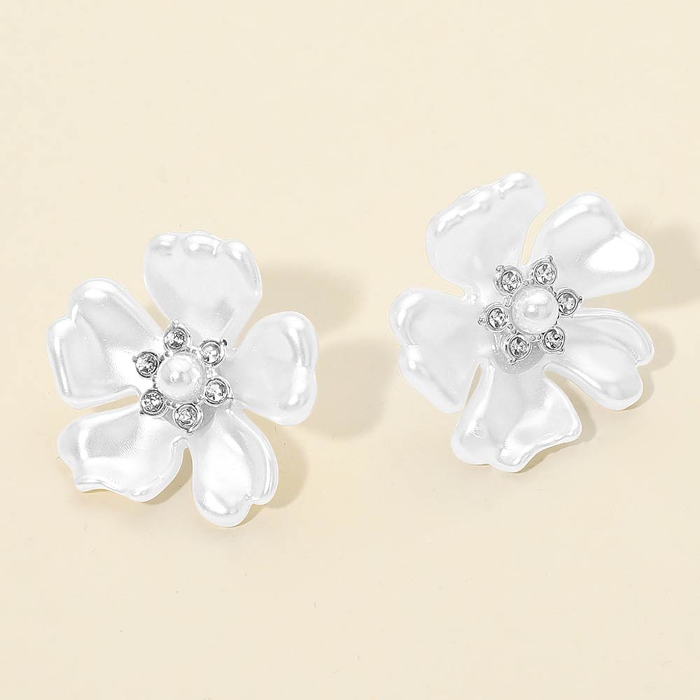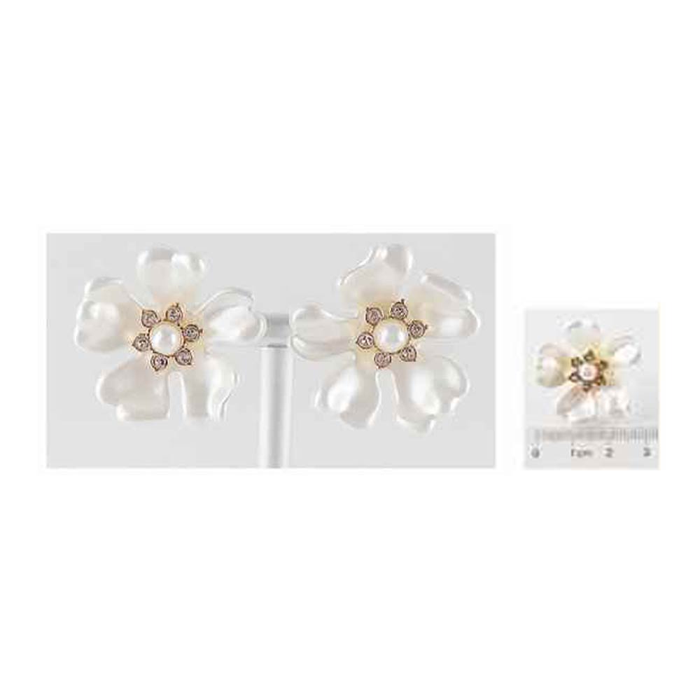 Details • Size : 1.25" X 1.2" • Post Back • These floral stud earrings showcase sculpted petal shapes arranged around a luminous pearl-style center with delicate crystal detailing. Designed for everyday elegance, they add a soft statement to casual outfits while pairing beautifully with dresses and special occasion looks.