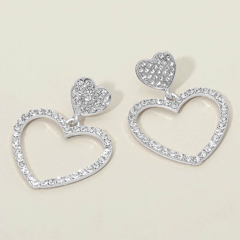 • Romantic drop earrings designed with a layered double heart silhouette featuring a crystal-outlined open heart paired with a pavĂ©-style heart stud. Lightweight with elegant movement, they add sparkle and charm to any look. Perfect for everyday wear, date nights, gifting, parties, and special occasions with timeless, feminine appeal.