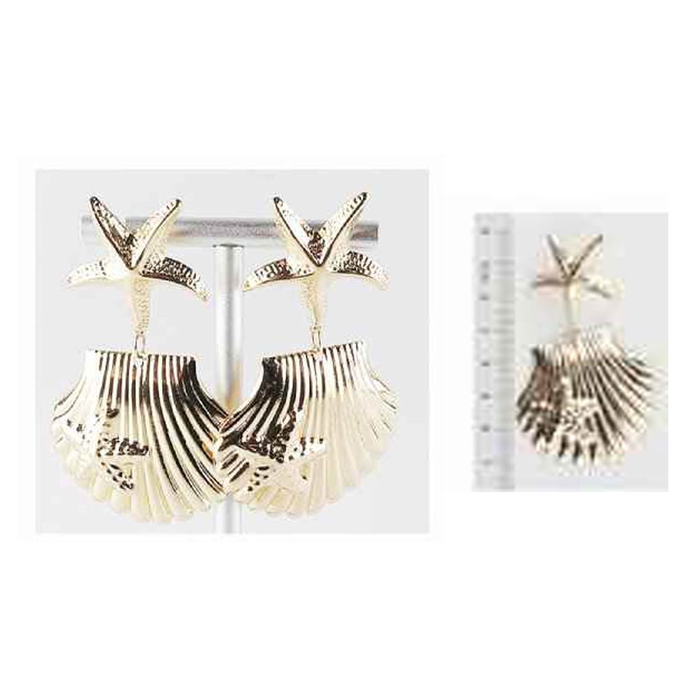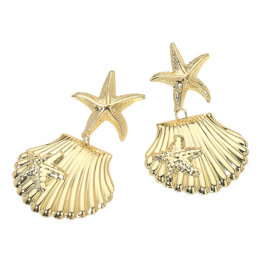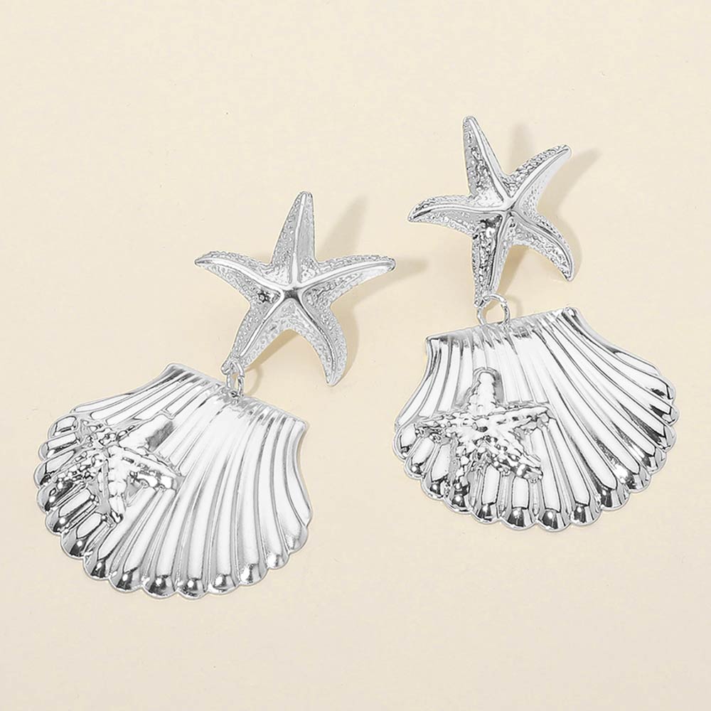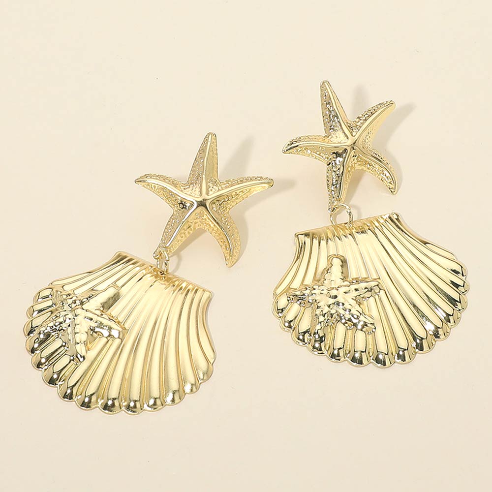 Details • Size : 1.8" X 2.8" • Post Back • These starfish shell drop earrings feature a layered ocean-inspired design with sculpted textures and a graceful drop silhouette. Ideal for summer outfits, beach vacations, resort wear, or everyday styling, they add a playful yet elegant accent that stands out beautifully without overpowering your look.