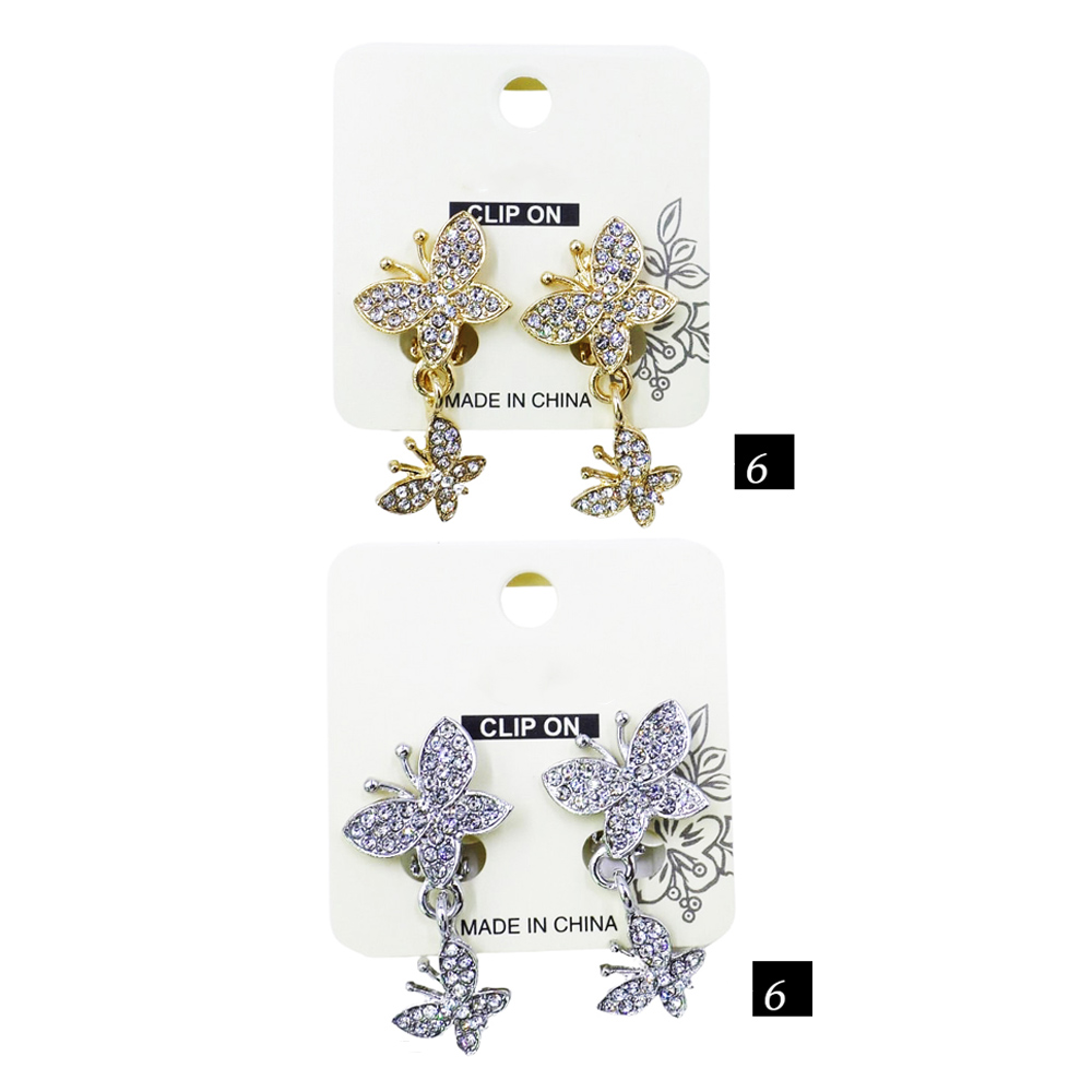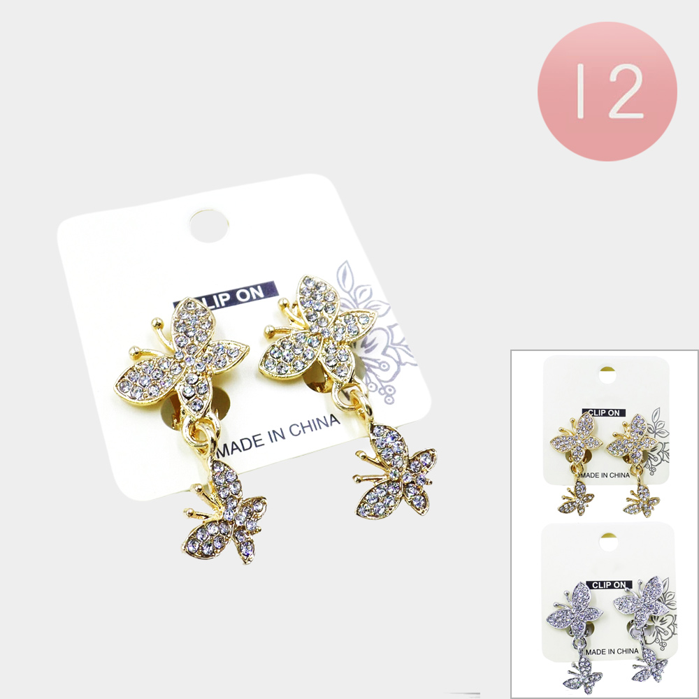12Pairs - Stone Paved Butterfly Dangle Clip On Earrings