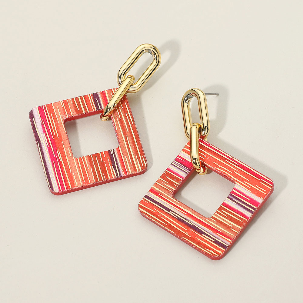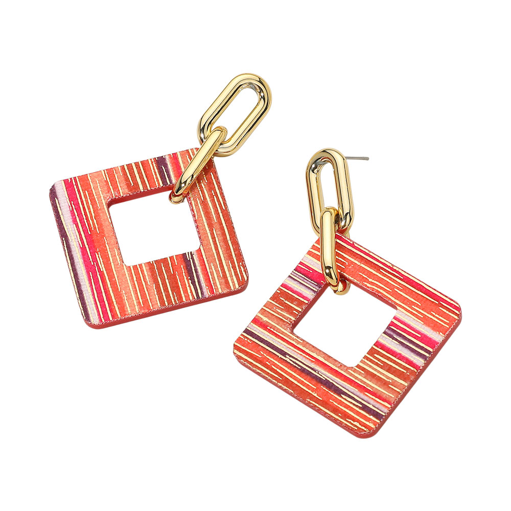 Details • Size : 1.8" X 2.6" • Post Back • These striped square link dangle earrings feature a geometric open-square design paired with bold metallic links. Their artistic striped finish adds a playful yet modern flair, making them a standout accessory for elevating both casual and statement fashion looks effortlessly.
