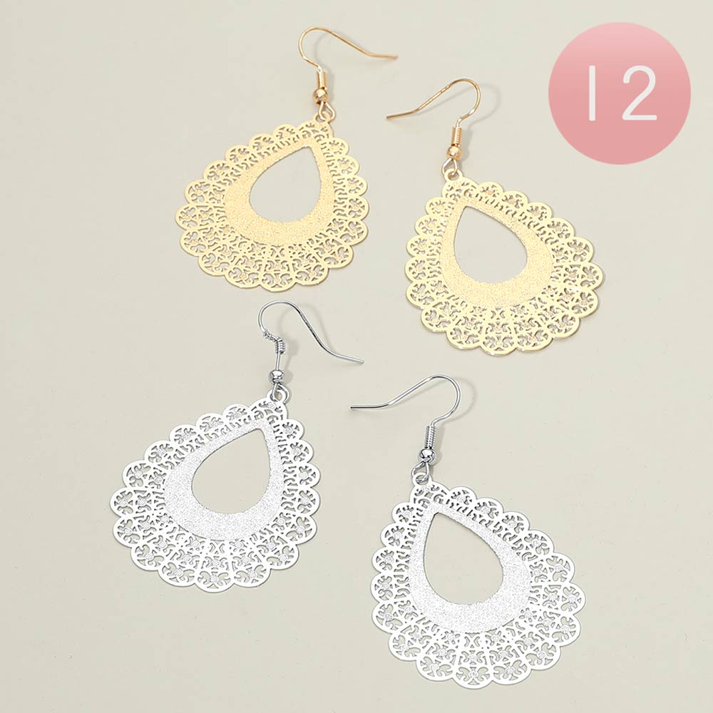 Details • Size : 1.4" X 2.4" • Fish Hook Back • Elegant teardrop drop earrings designed with intricate filigree openwork for a lightweight, refined look. Add graceful movement and statement detail to everyday outfits, vacations, and special occasions. Easy to wear and giftable, perfect for modern, boho, and romantic accessory styling.