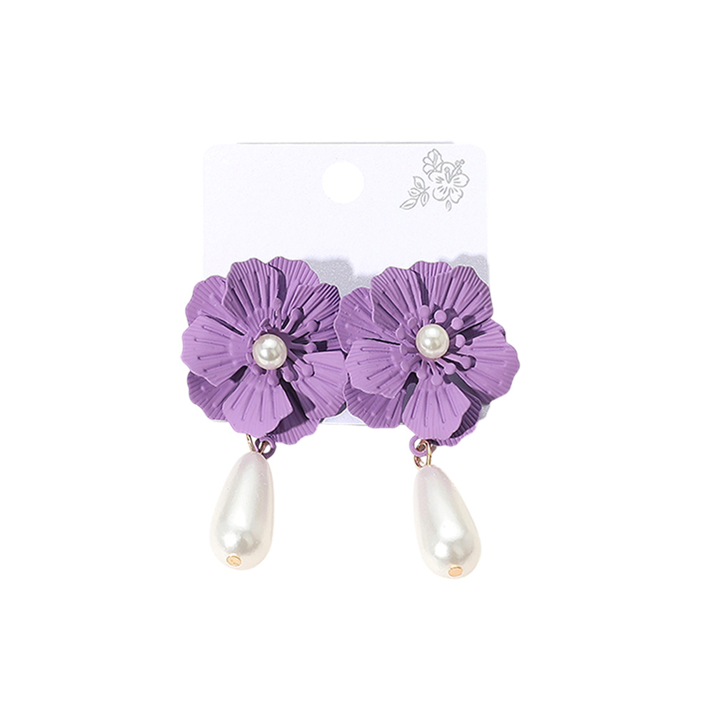Details • Size : 1.25" X 2" • Post Back • Elegant floral drop earrings featuring textured fabric petals, pearl centers, and teardrop dangles. Ideal for everyday wear or special occasions.