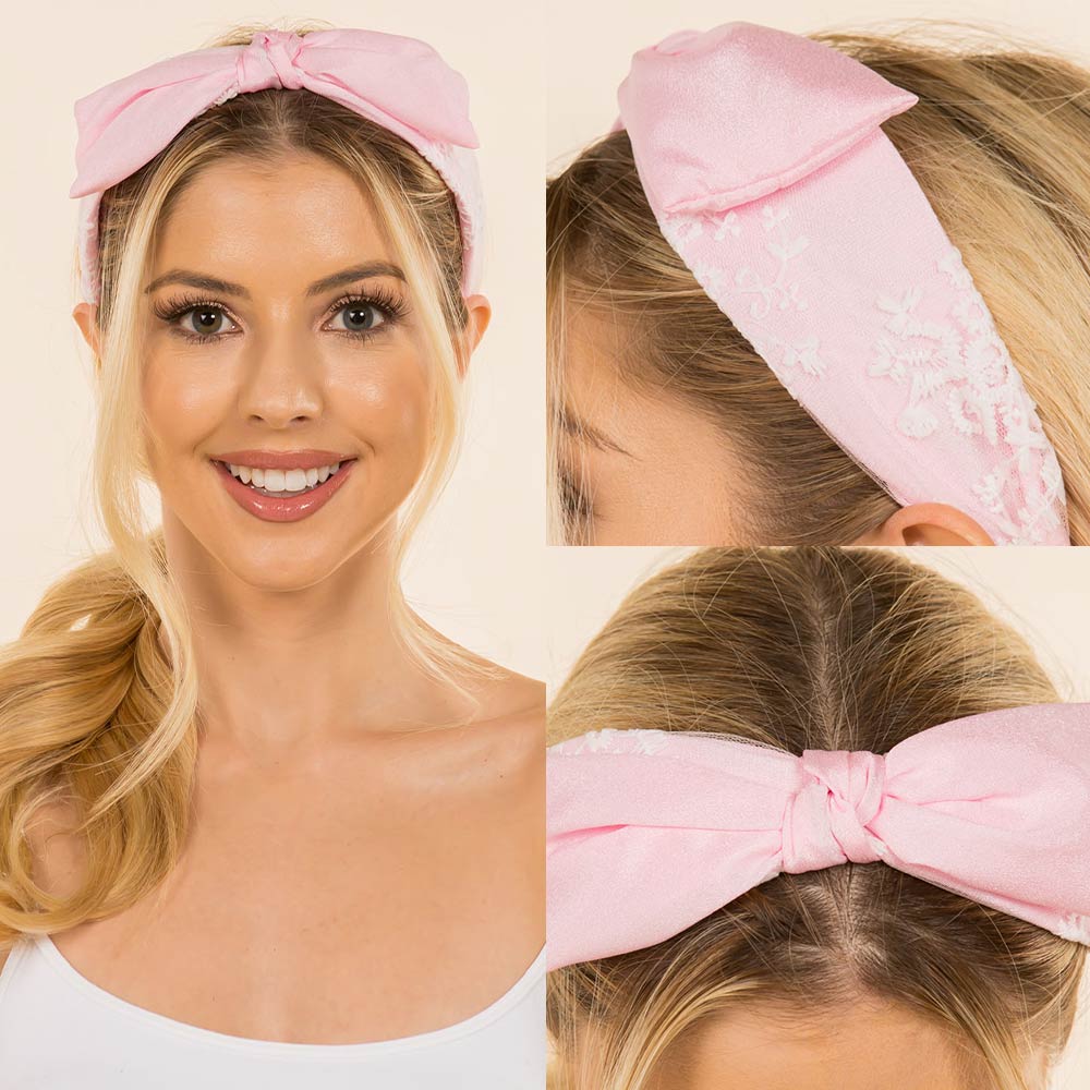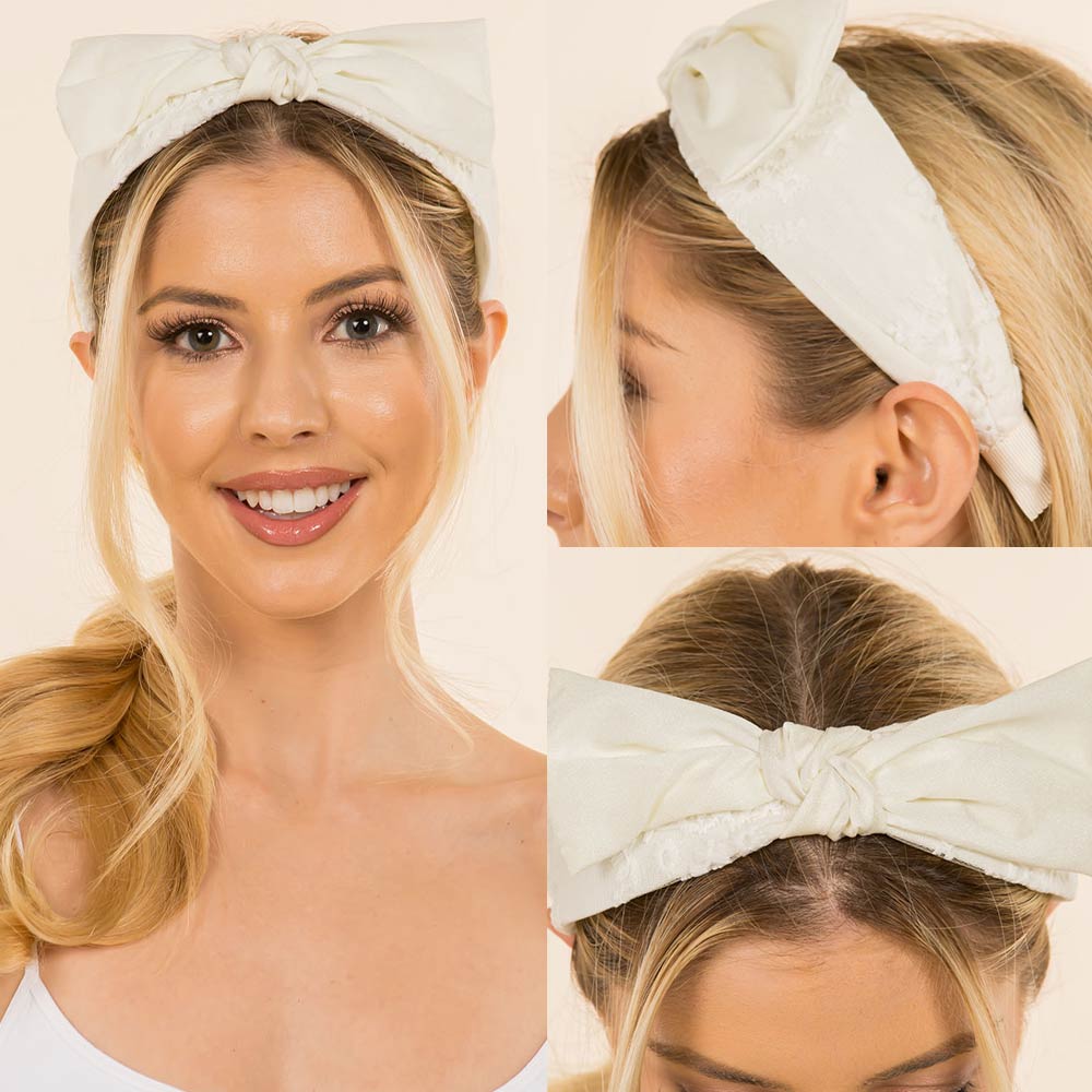 Details • Size : One Size • Embroidered bow knot headband designed with delicate stitched detailing and a soft, comfortable wrap fit. Adds a feminine, polished touch to everyday outfits, travel looks, or special occasions. Easy to style and wear, making it a versatile hair accessory for gifting and boutique collections.