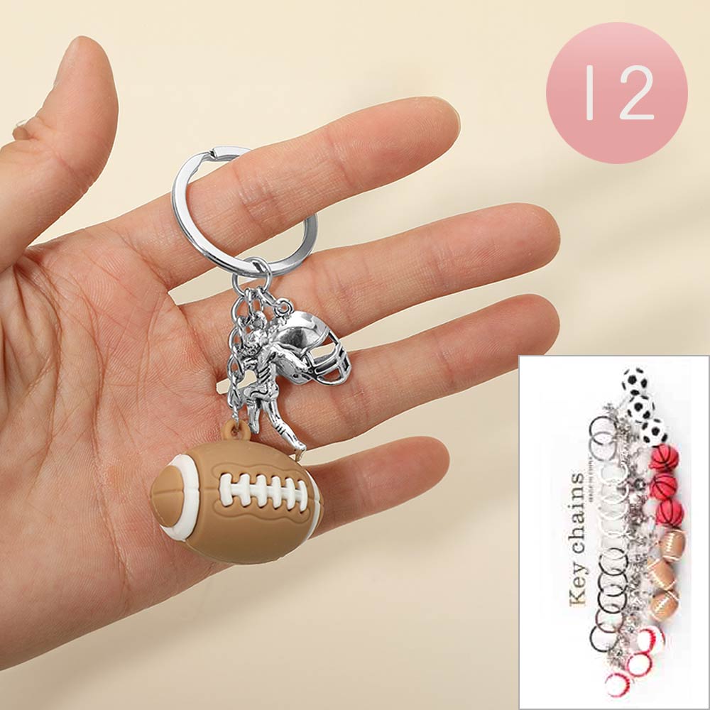 Details • Size : 3.25" L, 1.75" X 2.25" • Sports-themed charm keychain featuring a detailed player figure paired with a textured sports ball accent. Designed with a sturdy keyring and chain for everyday use on keys, backpacks, handbags, or gear bags. A fun novelty accessory ideal for game day displays, sports collections, fan gifts, party favors, and boutique accessories.