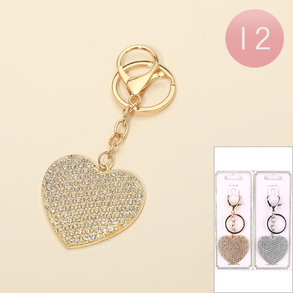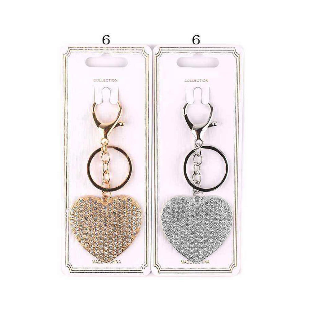 Details • Size : 4.25" L, 1.9" X 1.75" • Elegant heart shaped charm keychain featuring sparkling rhinestone accents and a secure clip design. Ideal for keys, handbags, backpacks, or gift add ons. Eye catching accessory that adds a touch of shine, perfect for boutiques, seasonal gifting, and impulse buy displays.