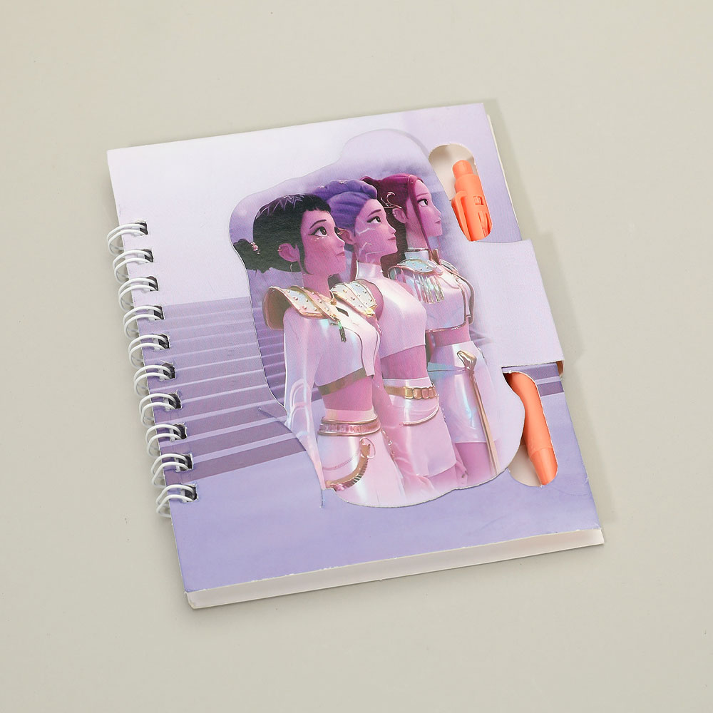 Details • Notebook Size : 4.25" X 5" • Ball Pen Size : 4" L • K-pop demon hunters spiral notebook featuring bold character artwork and a built-in pen holder. Designed for easy note-taking, journaling, and school use. A fun stationery item for fans, gift shops, and novelty collections that stands out on displays and encourages everyday creativity.