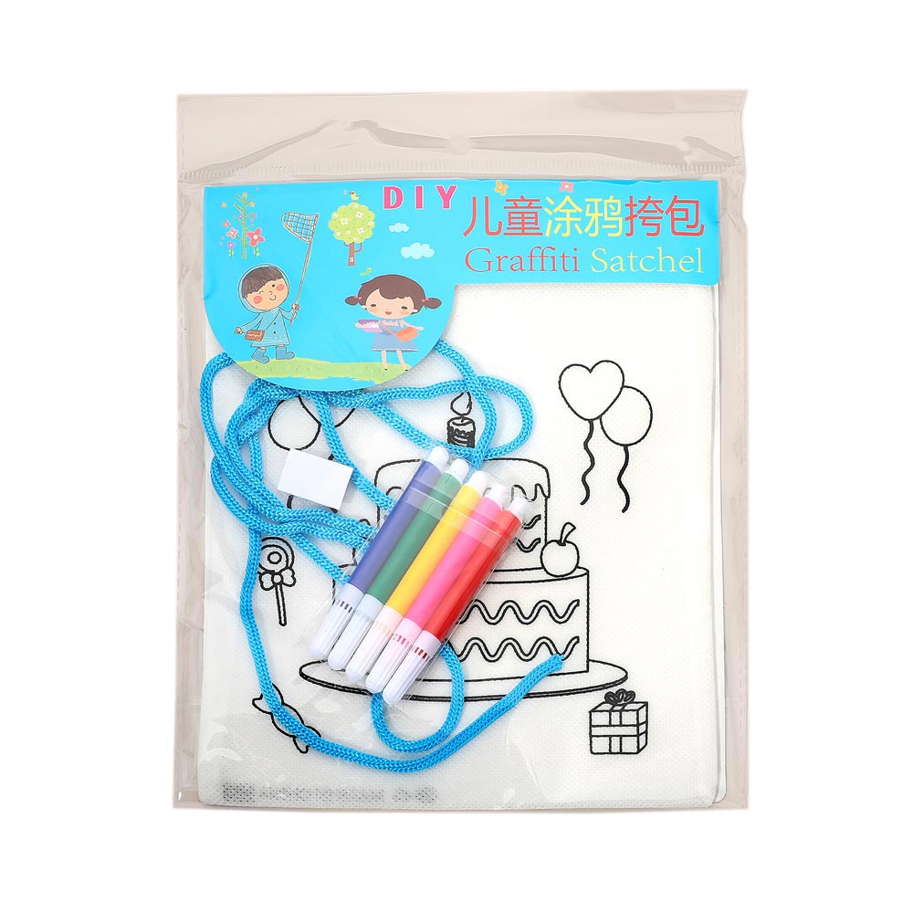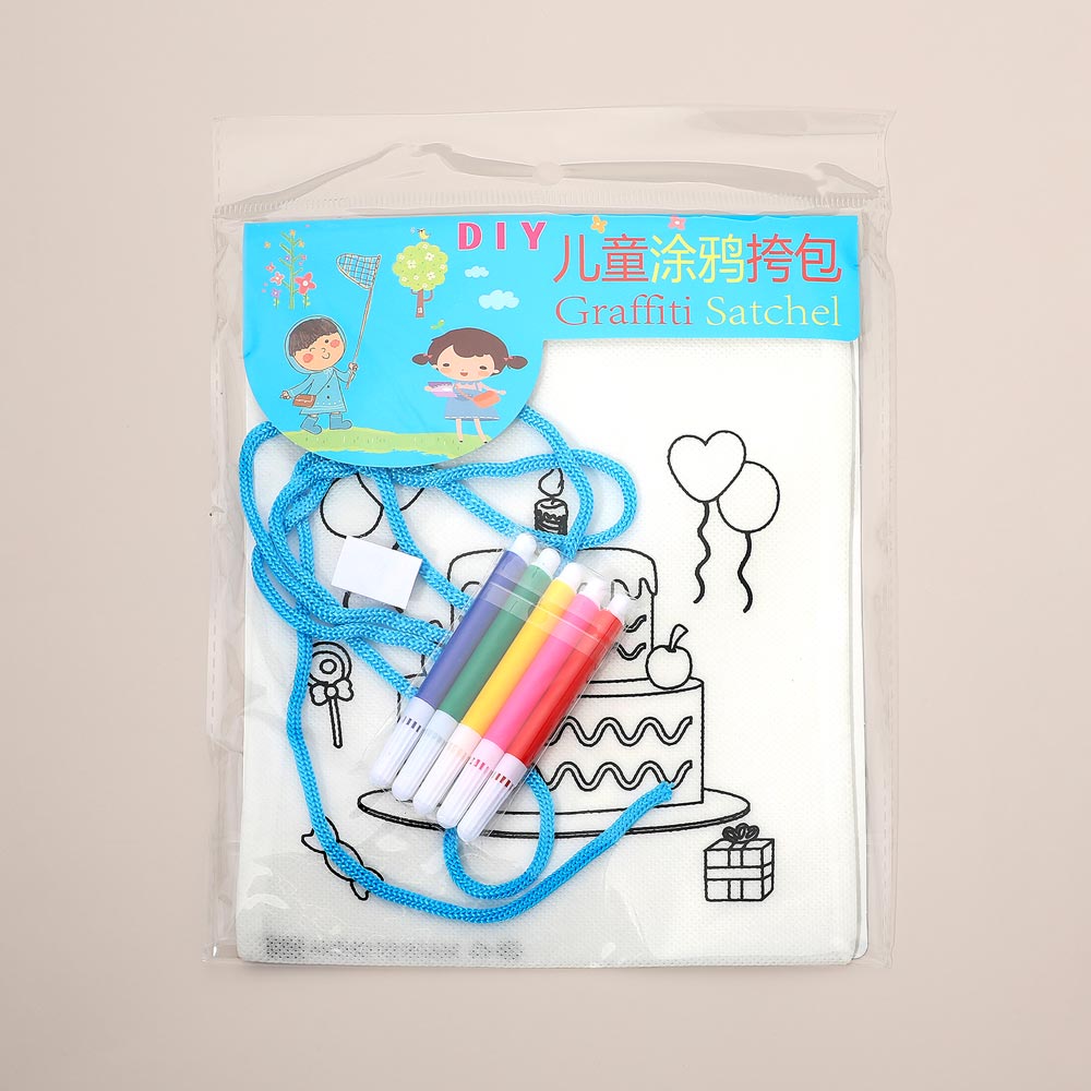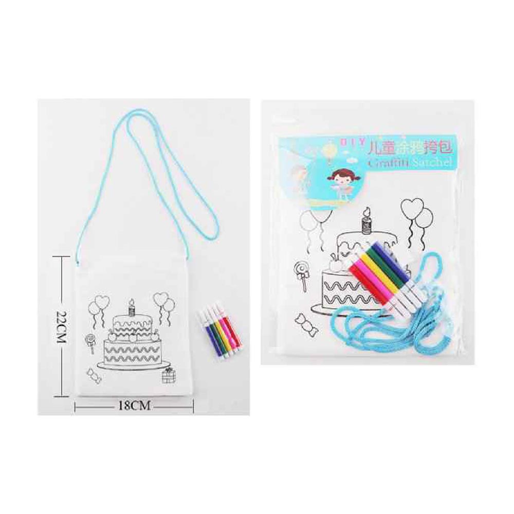 Details • Satchel Bag Size : 7" X 8.6" • Strap Size : 48" L • Pen Size : 3.5" L • Comes with 5 Colored Pens • DIY kids graffiti satchel craft set featuring a printable mini bag with included markers for creative decorating fun. Great for party favors, classroom crafts, travel activities, and rainy-day play, encouraging imagination, self-expression, and hands-on design enjoyment.