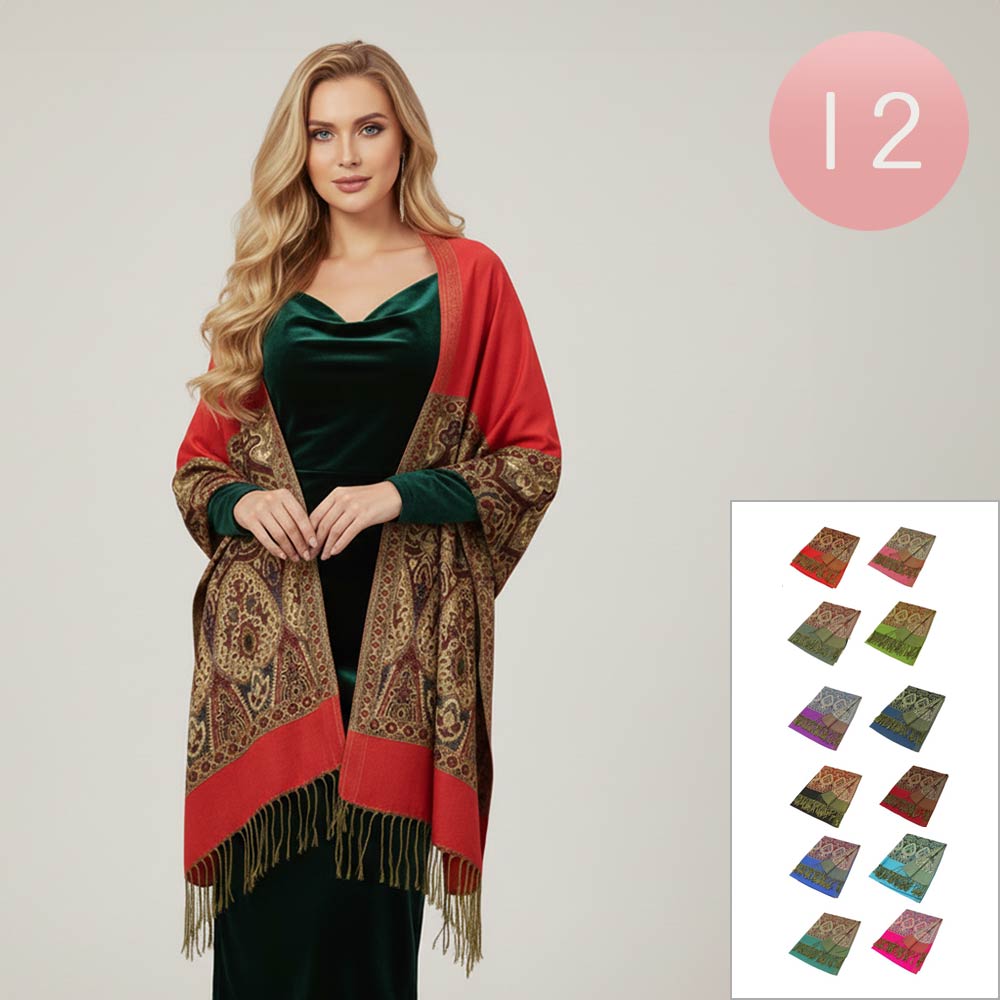 Details • Size : 27.5" X 76" • Fringe Size : 3.3" L • This fashion wrap scarf features an ornate paisley-inspired border with flowing fringe edges for an elevated, boutique-ready look. Designed for versatile draping and statement styling, it complements dresses and casual outfits while fitting well into seasonal collections, gift assortments, and curated accessory displays.