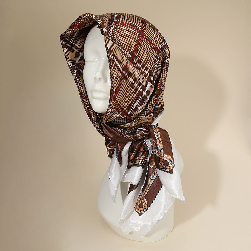 Details • Size : 36" X 36" • Material : 100% Polyester • Add timeless refinement to everyday outfits with this versatile square scarf featuring a refined check motif. Perfect for styling at the neck, hair, wrist, or bag, it offers effortless elegance for casual wear or elevated looks.