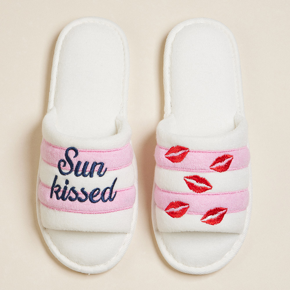 6Pairs - Kissy Lips Sun Kissed Message Embroidered Striped Pool Side Slippers / Home Indoor Floor Slippers