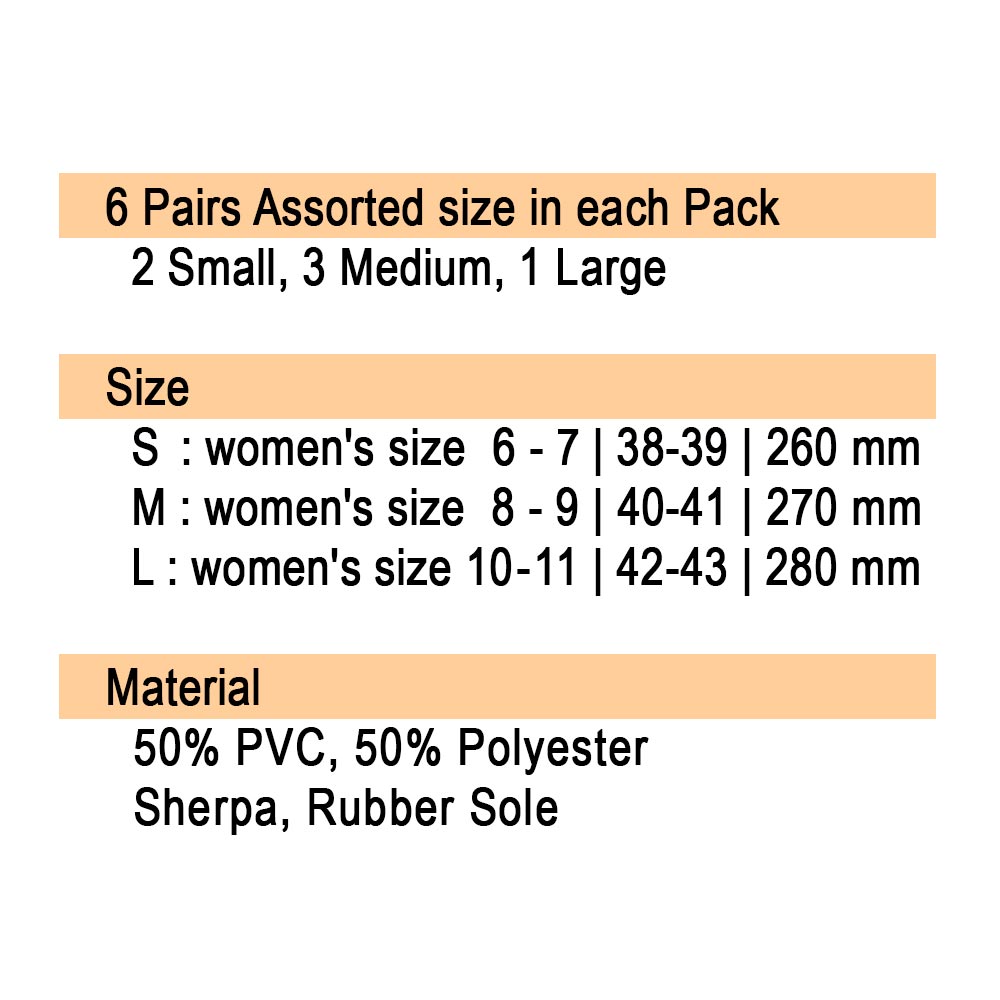Details • Size : 6 Pairs Assorted size in each pack • 2 Small, 3 Medium, 1 Large • S: women size 6-7 (260 mm) 38-39 • M: women size 8-9 (270mm) 40-41 • L: women size 10-11 (280mm) 42-43 • Material: 50% PVC, 50% Polyester • Sherpa, Rubber Sole • Treat your feet to luxury with these ultra-soft fuzzy slippers. Featuring a cozy faux fur lining and plush finish, they’re perfect for relaxing at home during the colder months.