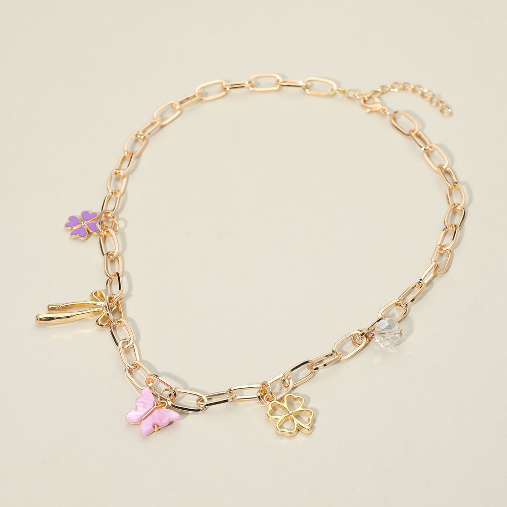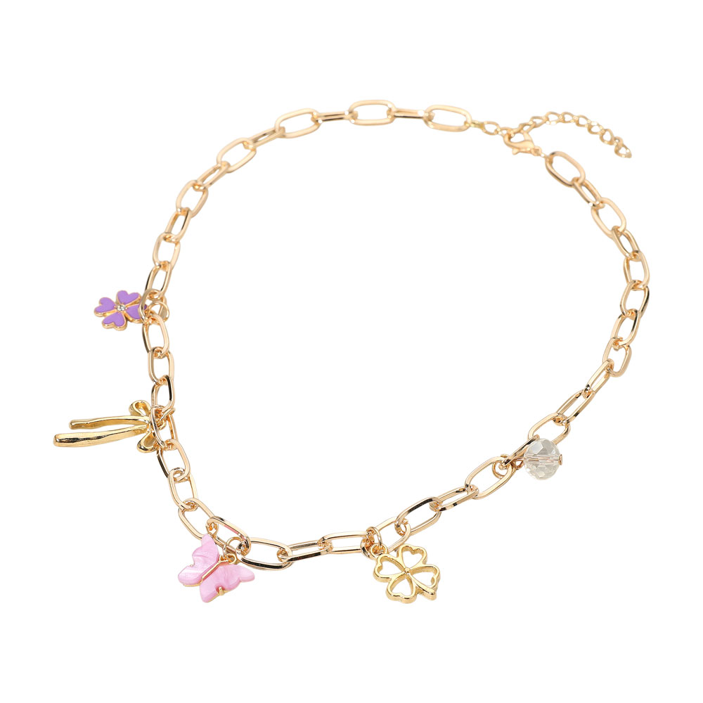 • This charming necklace features a mix of delicate pendants including butterfly, clover, and floral motifs suspended from a fine linked chain. Adjustable for the perfect fit, it brings a playful elegance to any look and makes a delightful accent for everyday or special occasions.