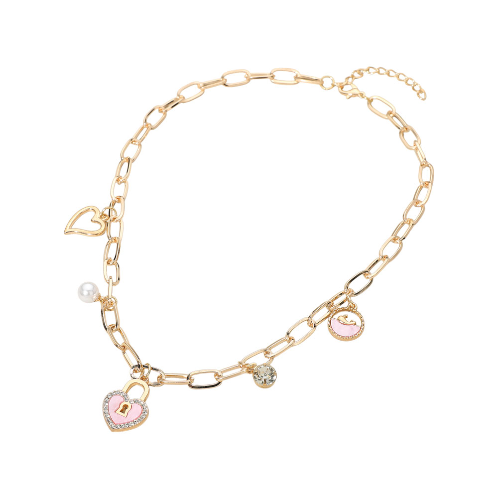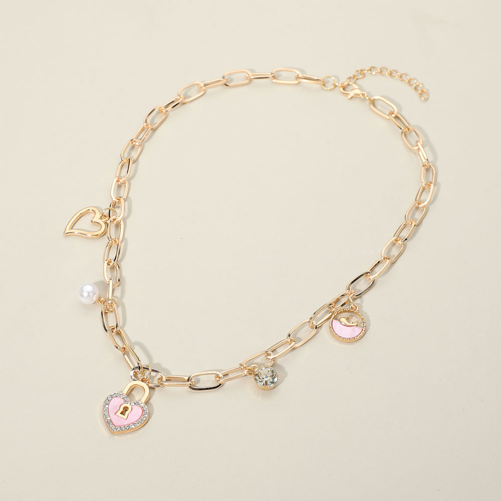• This heart charm chain necklace features a playful mix of linked accents and delicate pendants, including a sparkling lock charm for a romantic touch. Its adjustable design allows versatile styling, making it a standout piece that adds modern elegance and charm to any outfit.
