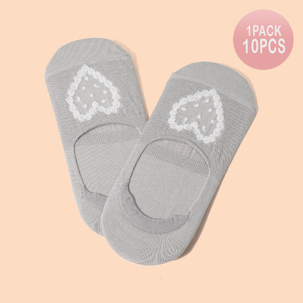 Details • Size : 9 - 11 • Material : Cotton, Spandex, Polyester, Polyurethane • Comfortable no-show socks featuring a cute heart pattern. Ideal for everyday wear with flats or sneakers. Breathable, soft fabric and a snug fit. Comes in a value pack of 10 pairs. • Made In Korea