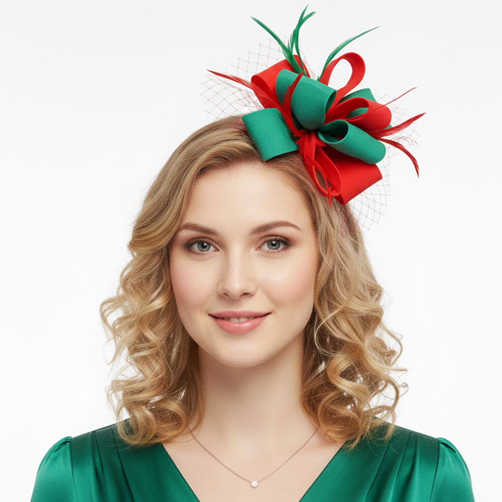 Details • Size : 7" X 8" • Dual : Hair Pinch Clip / Headband • Make a bold statement with this bow and feather mesh fascinator hair clip. Designed with layered loops, airy netting, and delicate feathers, it adds sophistication and flair to any formal event, cocktail party, or festive celebration.