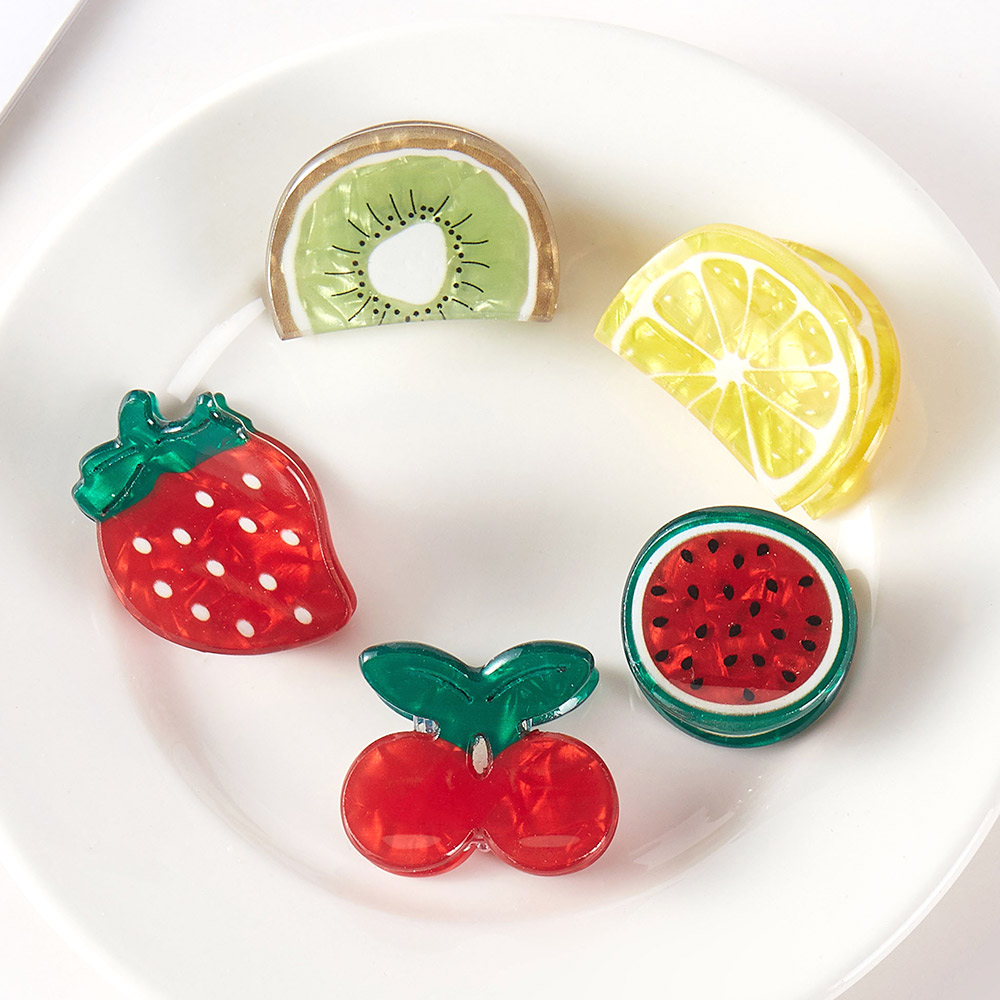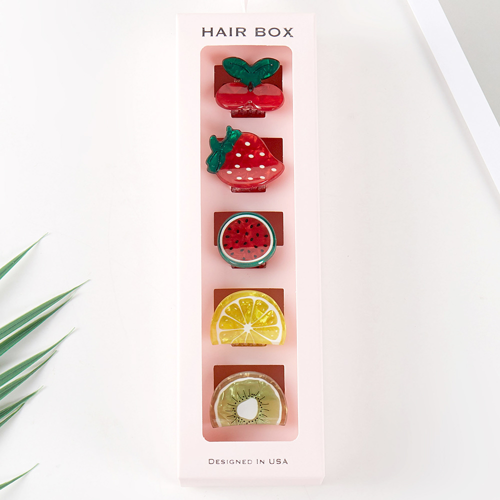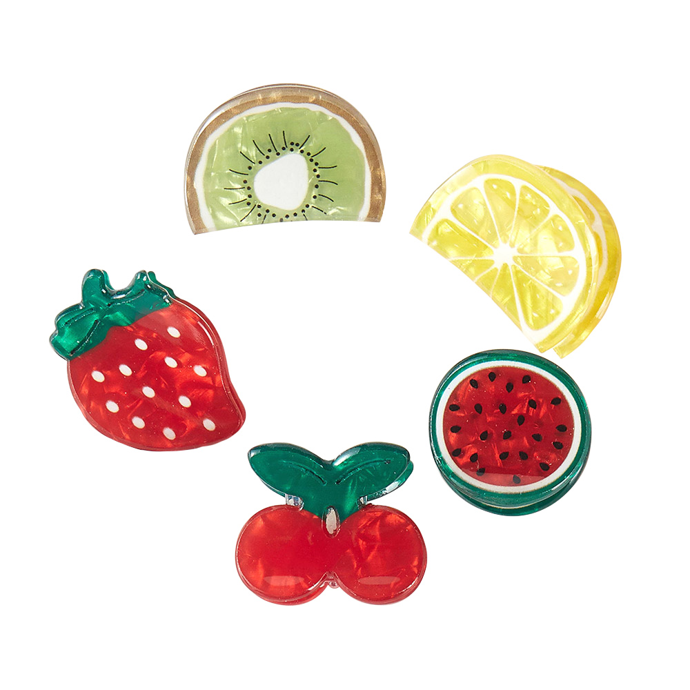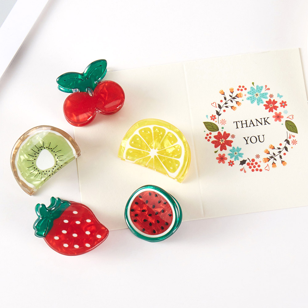 Details • Strawberry, Kiwi, Lemon, Watermelon and Cherry • Size : 0.8" L - 1.1" L • Card Size : 2" X 3" • Material : 50% PVC, 50% Alloy • 1 Message Card Included • Liven up your hair accessories with this set of assorted fruit hair clips. Features playful shapes like strawberry, lemon, kiwi, and more—perfect for cute, vibrant looks.