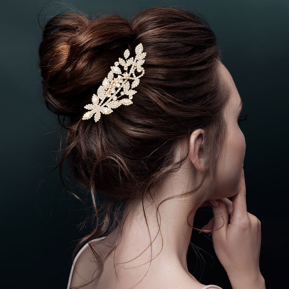 • Elevate any hairstyle with this radiant cz stone leaf hair comb featuring shimmering stones arranged in an intricate, nature-inspired pattern. Its lightweight and secure design adds refined brilliance, making it ideal for weddings, special events, or adding elegant sparkle to everyday looks.