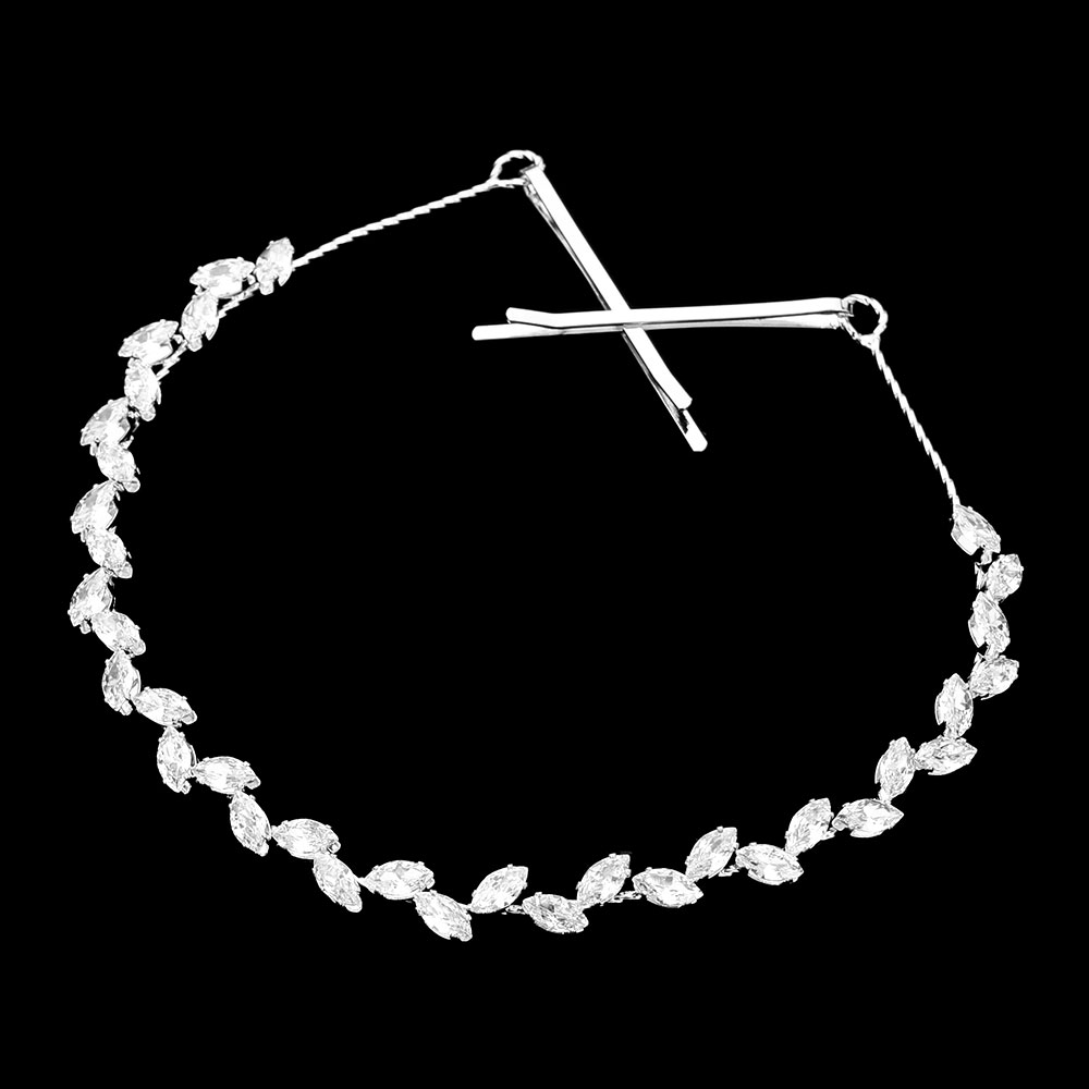 Details • Size : 11" X 0.3" • A Pair Bobbi Pin Included • This bridal crystal leaf hair vine brings refined sparkle to any wedding hairstyle. Featuring marquise-cut cz stones in a graceful vine pattern, it bends easily for customized placement around updos or braids, creating a timeless and elegant finishing touch for special occasions. • CZ Cubic Zirconia • Lead and Nickel Compliant