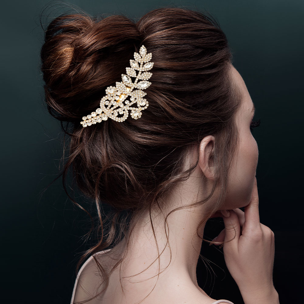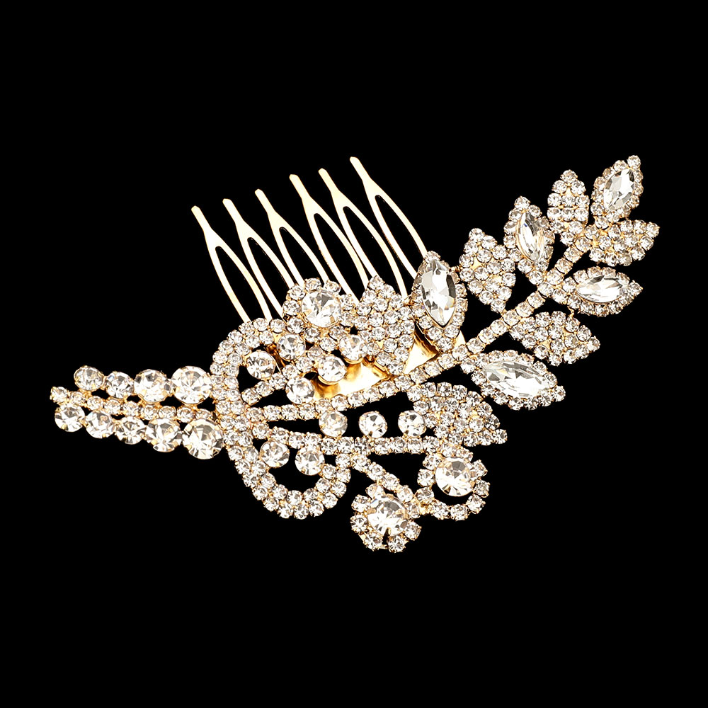 • Enhance your special occasion look with this radiant hair comb featuring a blend of swirling accents and delicate leaf motifs. Its shimmering arrangement catches the light beautifully, offering a refined, eye-catching finish that complements both timeless and contemporary hairstyles.
