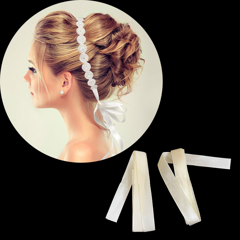 Details • Size : 10.25" X 0.75" • A Pair Bobby Pin Included • Romantic bridal hair halo featuring sparkling crystal floral accents and a satin ribbon tie. A perfect wedding accessory to complement elegant updos and loose hairstyles, adding timeless sparkle and charm. • Lead and Nickel Compliant