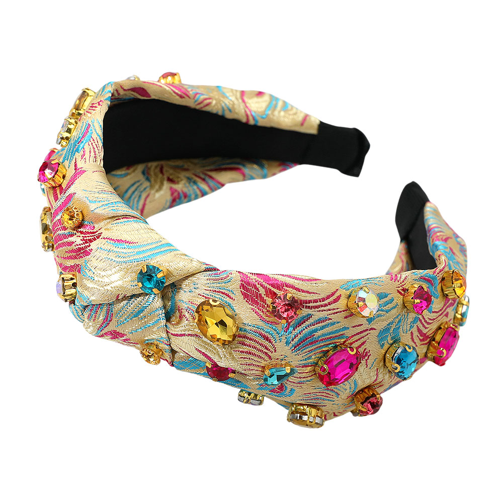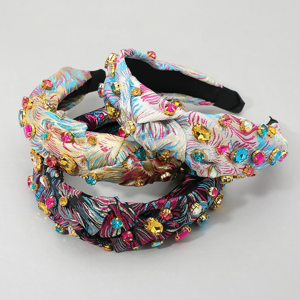 • This luxurious headband features a rich jacquard design adorned with vibrant crystal embellishments for a dazzling statement look. Perfect for adding artistic flair to any ensemble, it offers a bold blend of elegance and creativity, ideal for special occasions or daily glam.