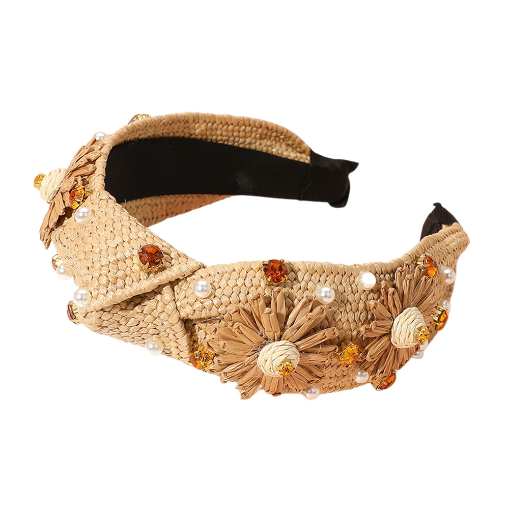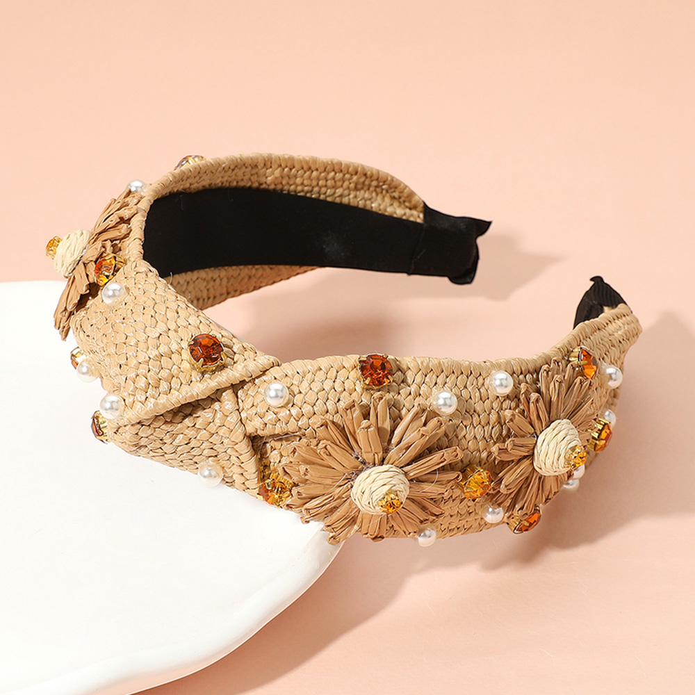 Paper Flower Pearl Stone Cluster Embellished Raffia Weave Knot Headband