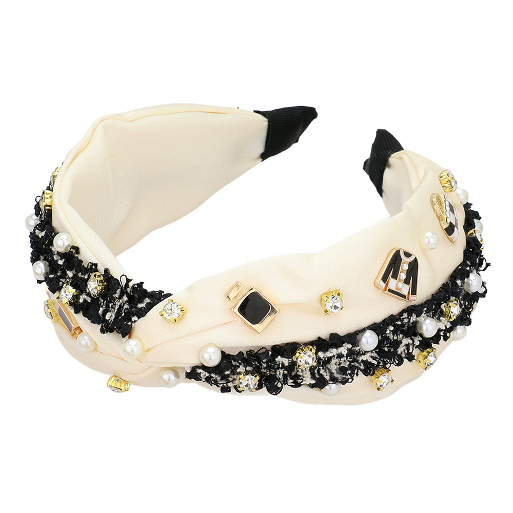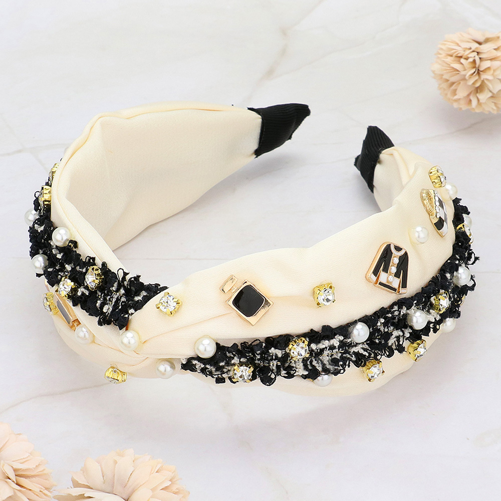 Pearl Stone Cluster Enamel Cloth Bag Perfume Charm Embellished Tweed Mix Two Tone Knot Headband