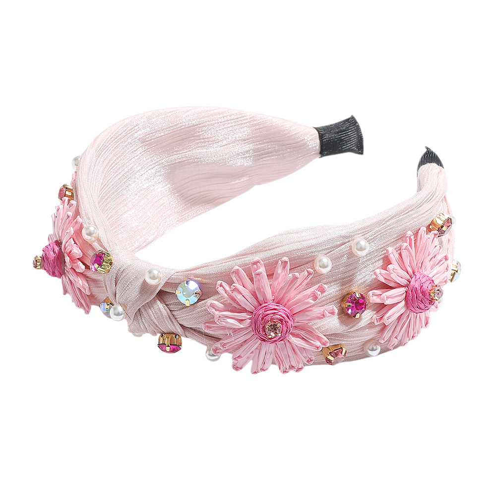 Stone Cluster Pearl Embellished Raffia Flower Pointed Shiny Fabric Knot Headband